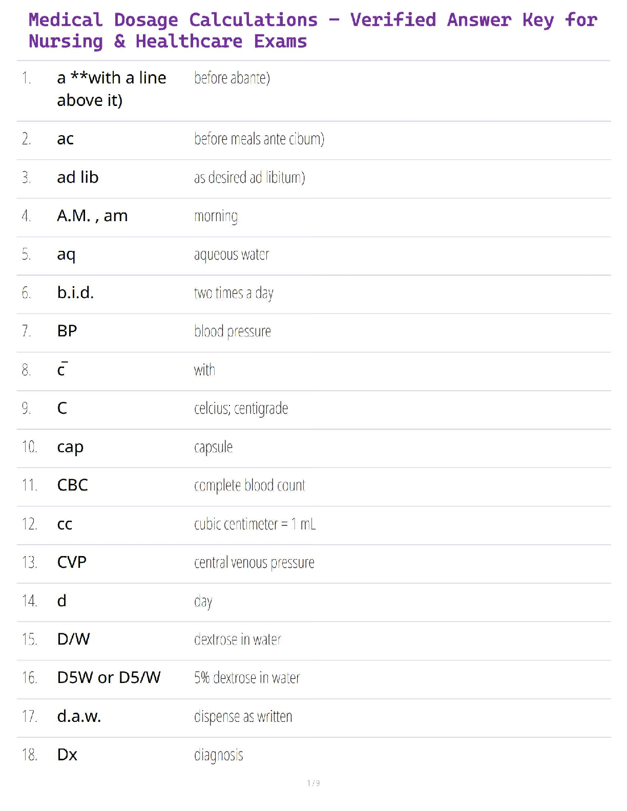 Pharmacology > QUESTIONS and ANSWERS > Medical Dosage Calculations – Verified Answer Key for Nursing & Healthcare Exams