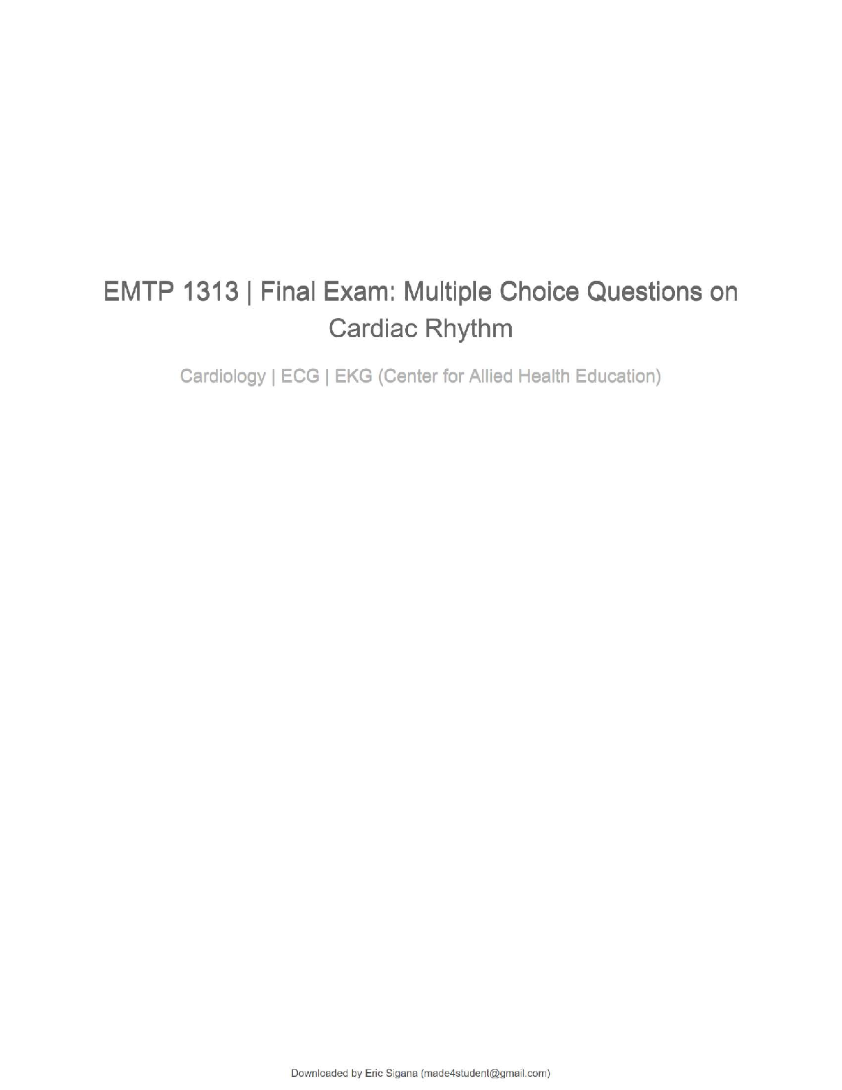 *NURSING > QUESTIONS and ANSWERS > EMTP 1313 | Final Exam: Multiple Choice Questions on Cardiology | ECG | EKG (Center for Allied Health Education)