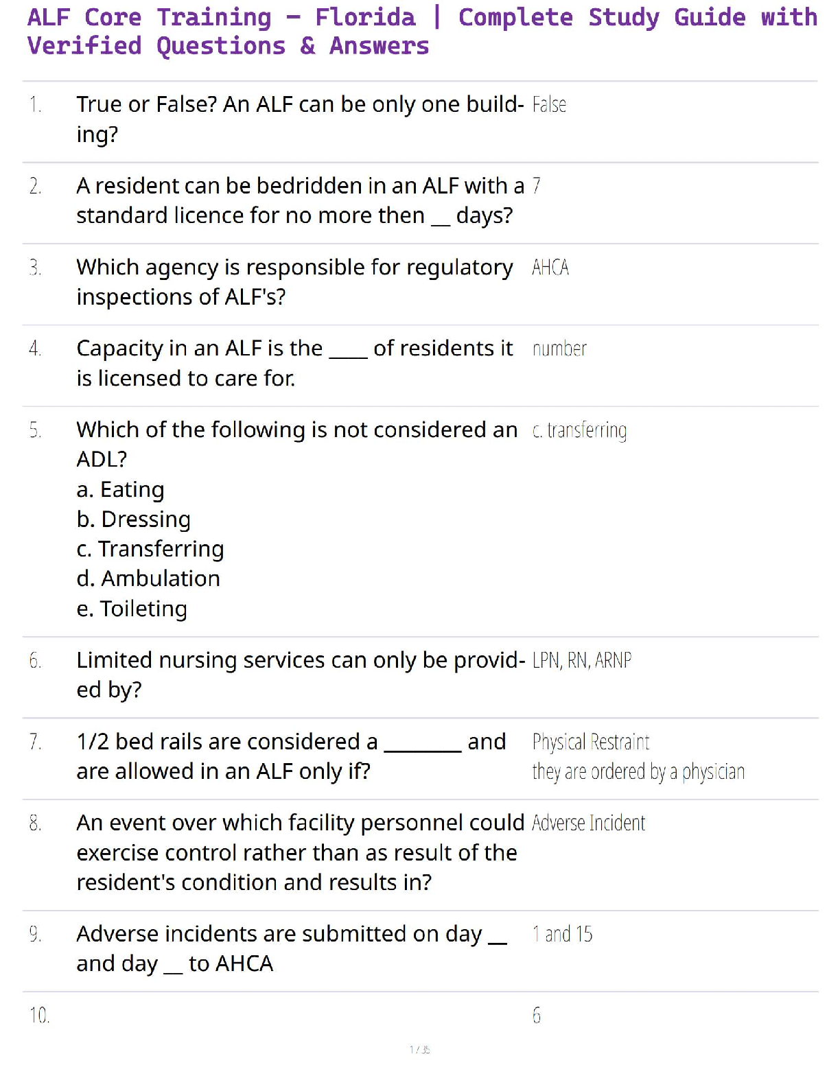*NURSING > QUESTIONS and ANSWERS > ALF Core Training – Florida | Complete Study Guide with Verified Questions & Answers