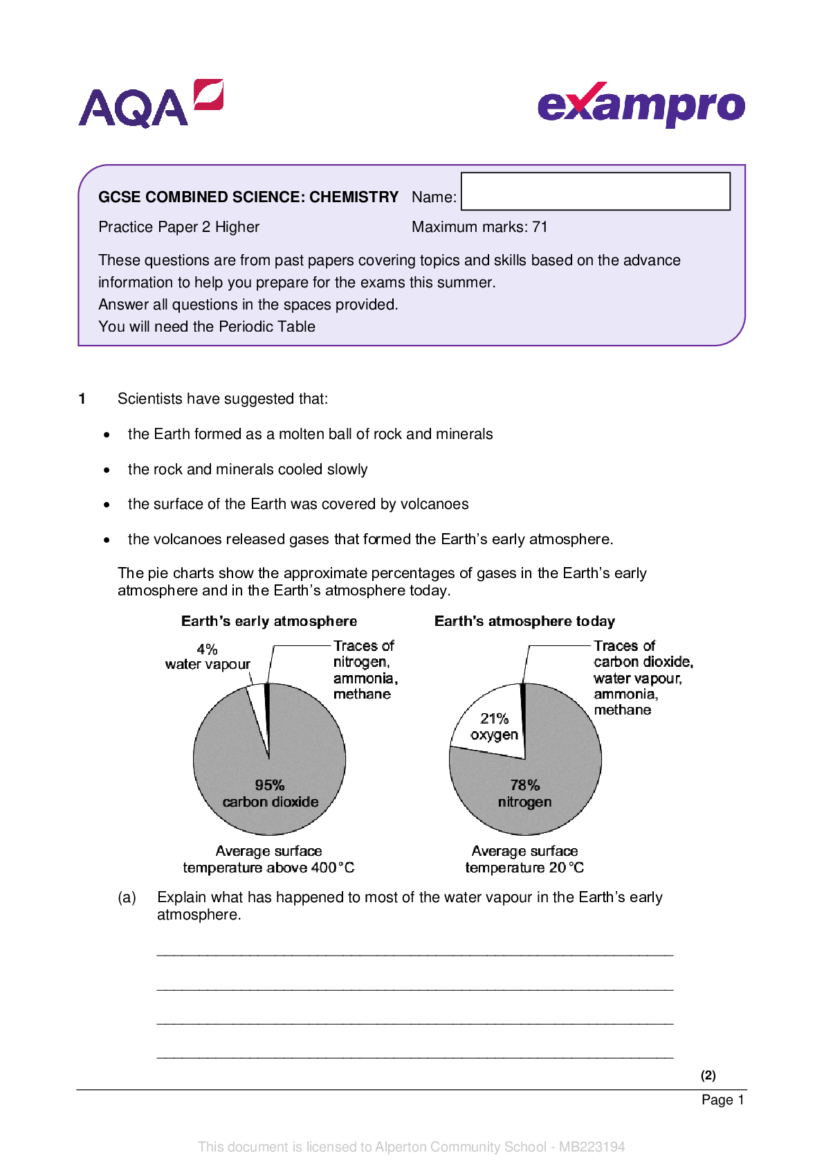 Chemistry > QUESTION PAPER (QP) > AQA_GCSE_Trilogy_Chemistry_1H_MS. Exampro/ GCSE COMBINED SCIENCE: CHEMISTRY. QUESTION PAPER. Practice Paper 2 Higher Maximum marks: 71. Predicted Papers 2022.