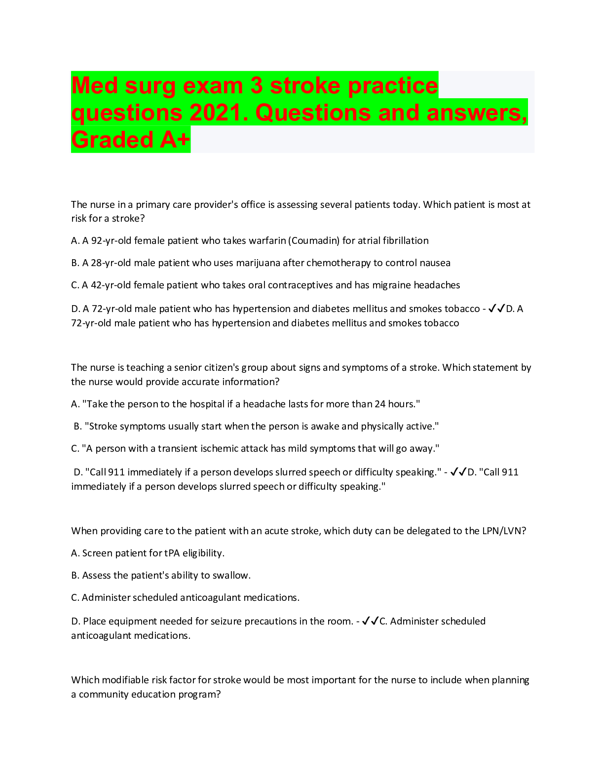 *NURSING > MED-SURG EXAM > Med surg exam 3 stroke practice questions 2021. Questions and answers, Graded A+