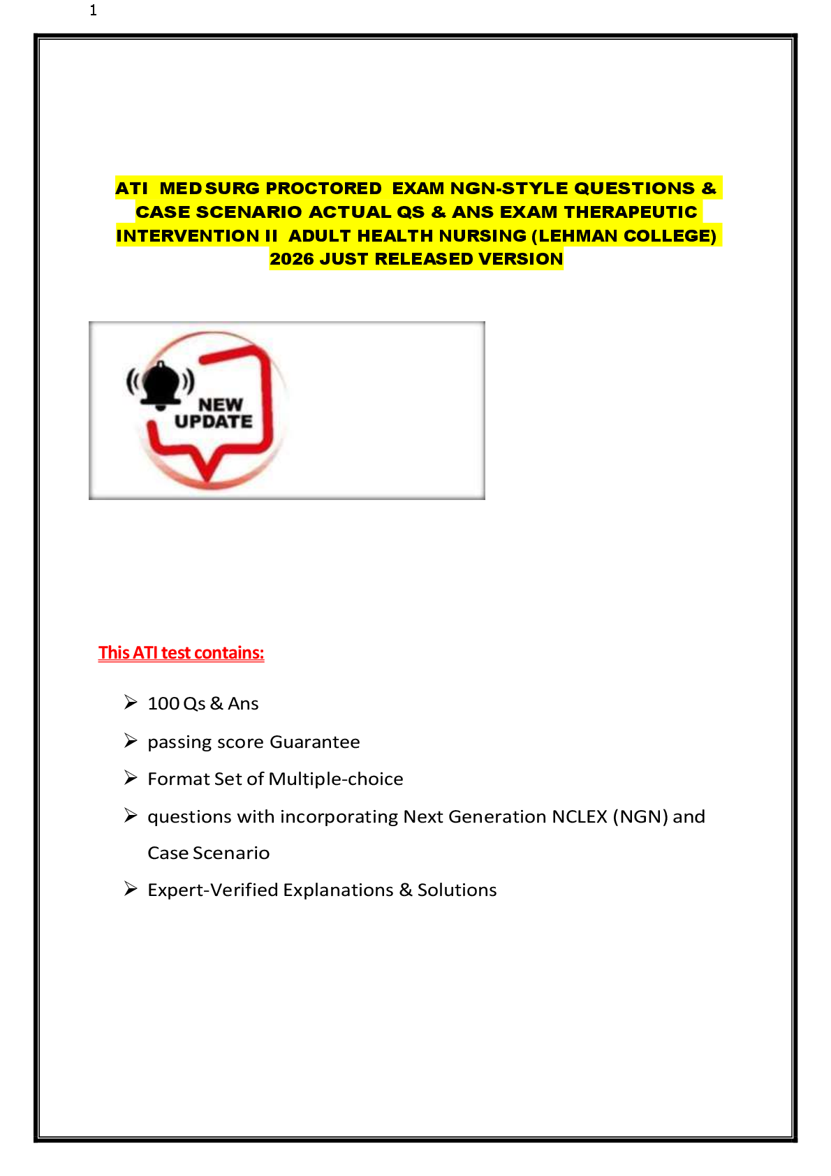 ATI Med Surg > MED-SURG EXAM > ATI MED SURG PROCTORED EXAM NGN-STYLE QUESTIONS & CASE SCENARIO ACTUAL QS & ANS EXAM THERAPEUTIC INTERVENTION II ADULT HEALTH NURSING (LEHMAN COLLEGE) 2026 JUST RELEASED VERSION