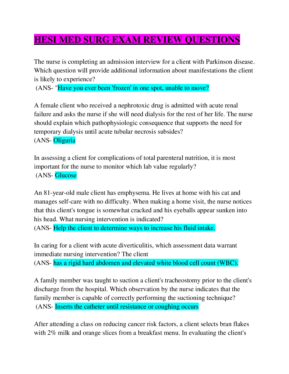 Health Care > HESI MED SURG > HESI MED SURG EXAM REVIEW QUESTIONS & ANSWERS