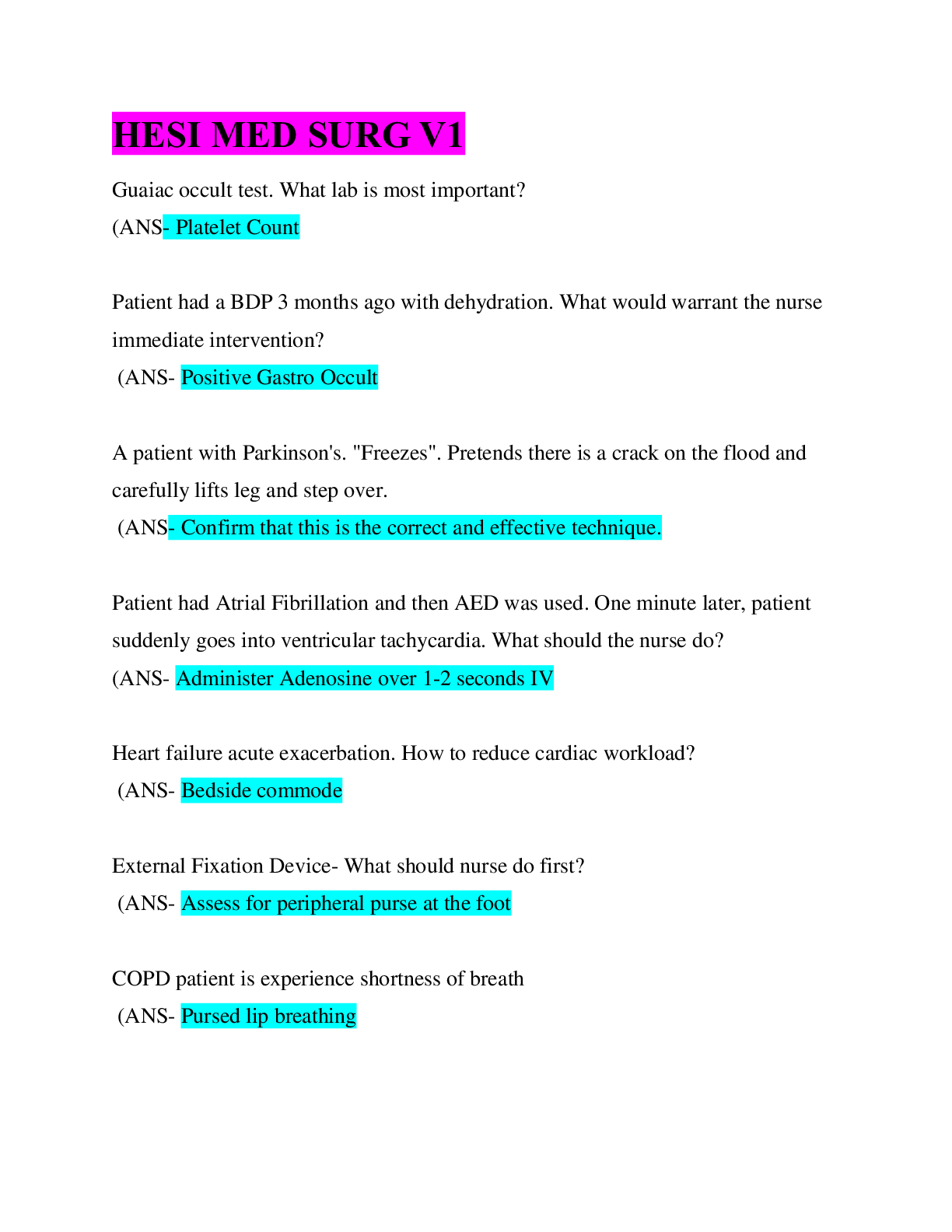 Health Care > HESI MED SURG > HESI MED SURG V1/ Latest Version/ Questions& Answers