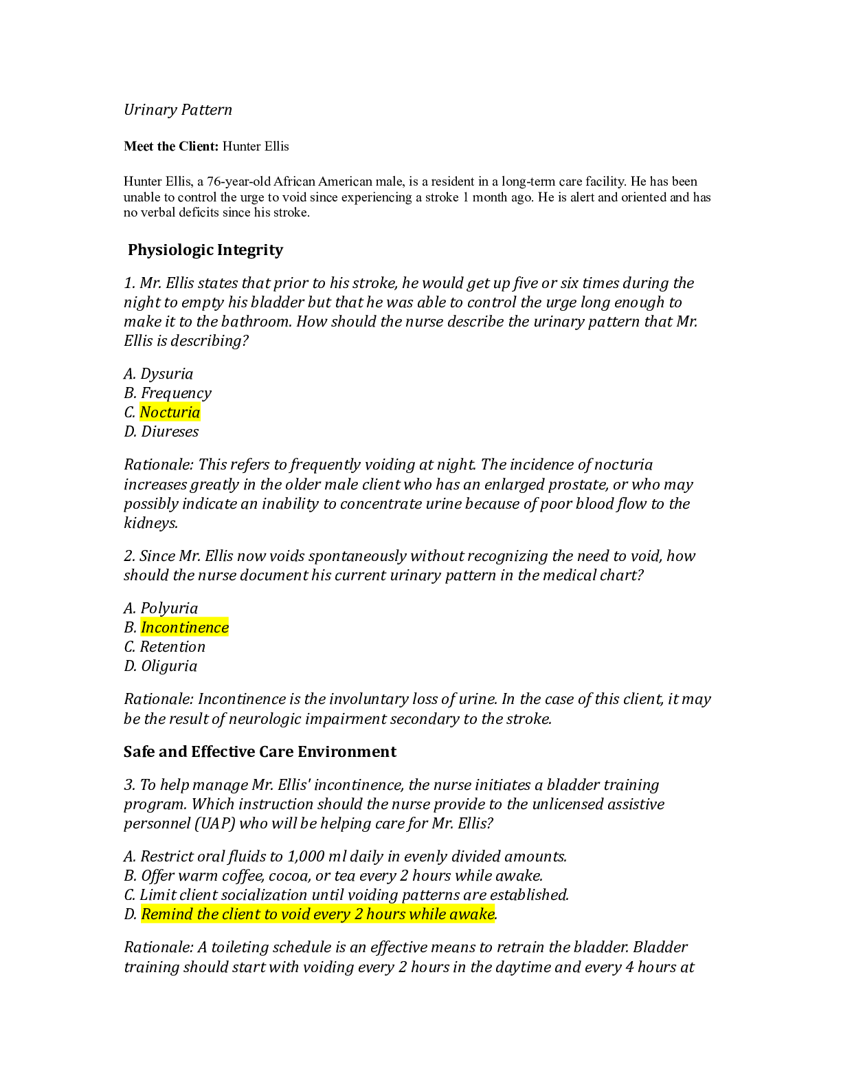 *NURSING > HESI MED SURG > HESI Case Study Nursing. Urinary Pattern. Notes, Questions Answers and Rationale.