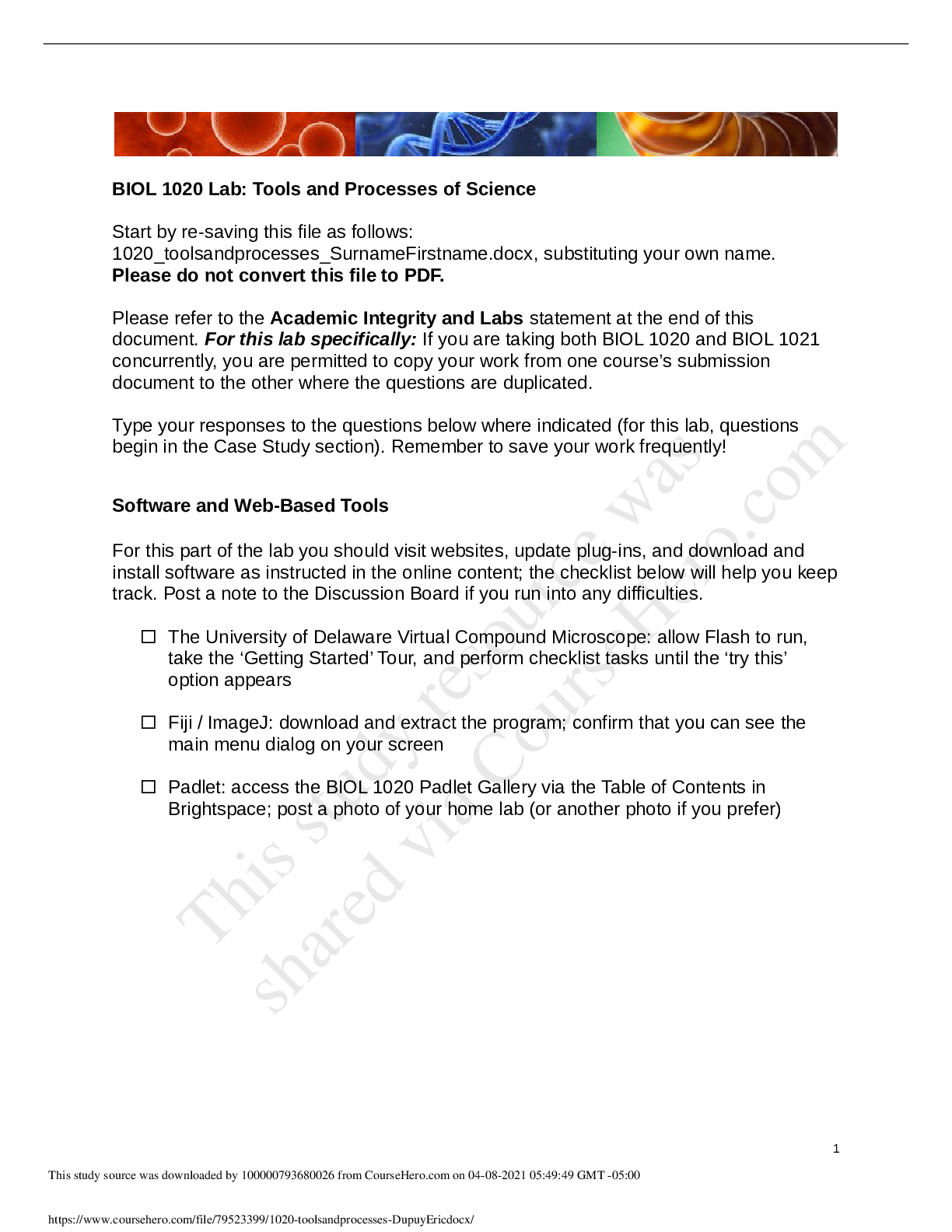 Biology > Lab Experiment > BIOL 1020 Lab: Tools and Processes of Science