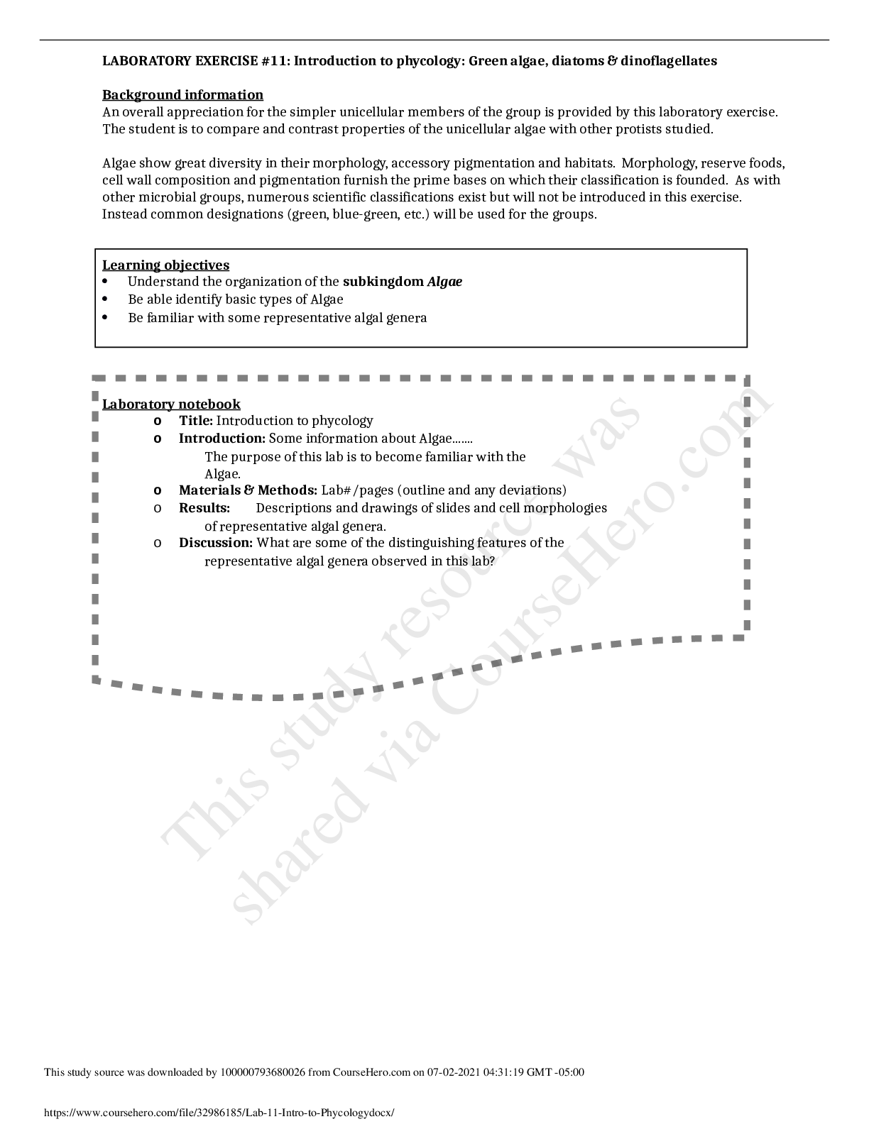 Micro Biology > Lab Report > San Jose State UniversityMICRO 101Lab 11 Intro to Phycology