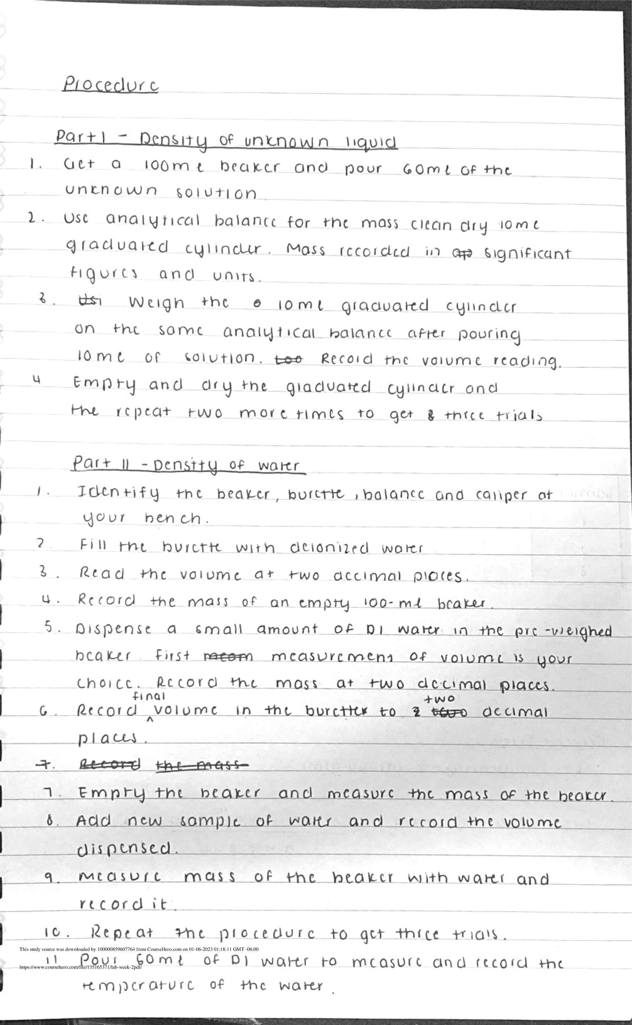 > Lab Experiment > lab week 2 Georgia State University CHEMISTRY 1211K: Density of Unknown Liquid & Density of water, Plus Calculations