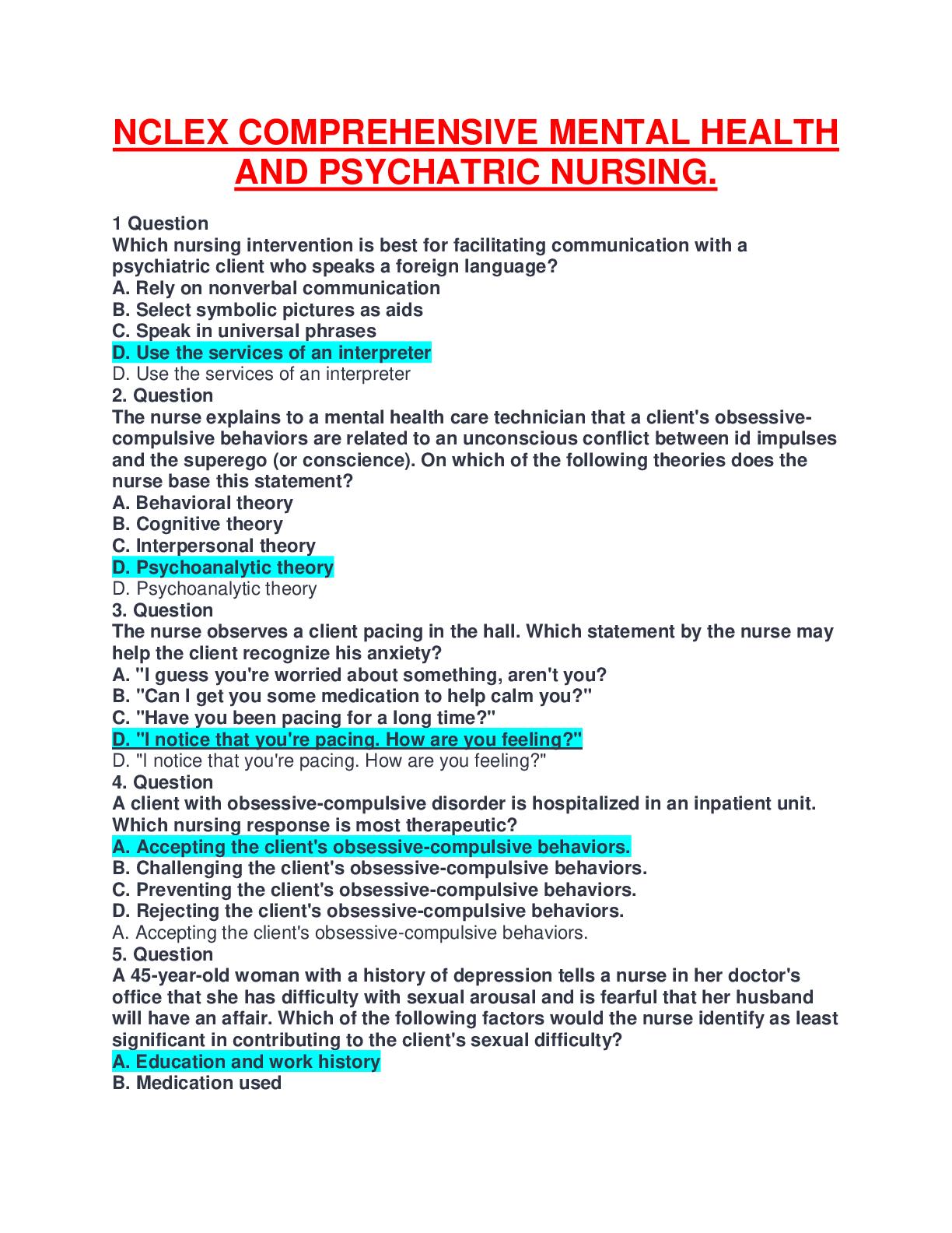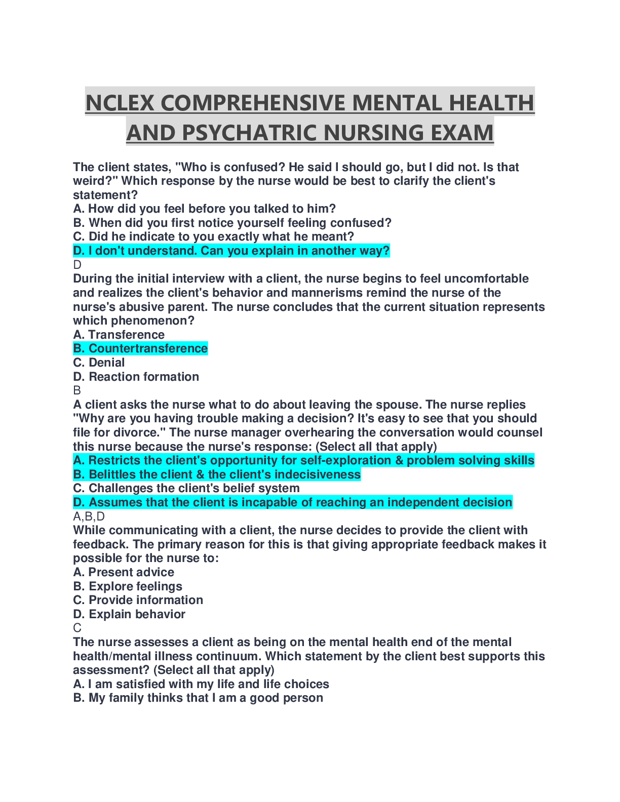 *NURSING > NCLEX > NCLEX COMPREHENSIVE MENTAL HEALTH AND PSYCHATRIC NURSING EXAM