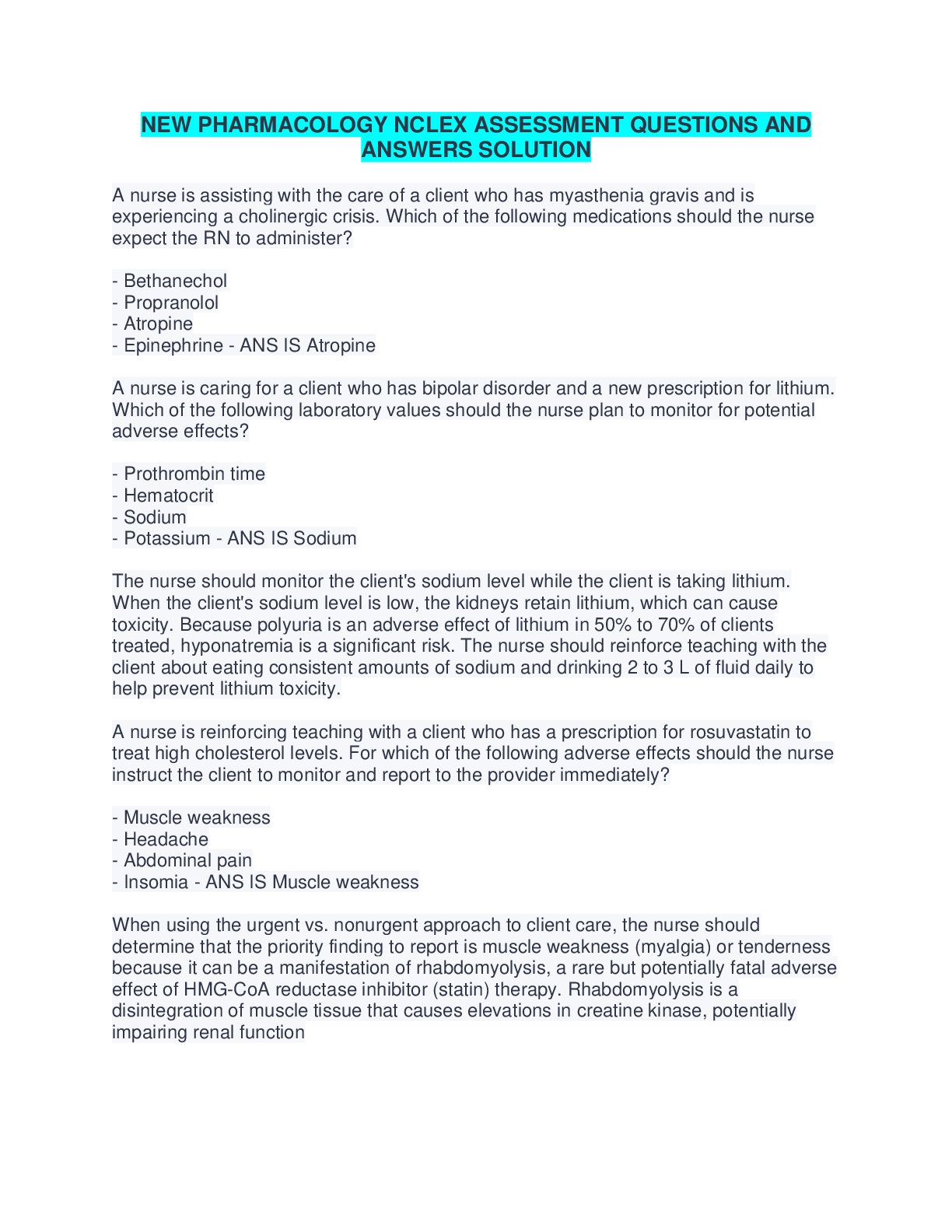 *NURSING > NCLEX > NEW PHARMACOLOGY NCLEX ASSESSMENT QUESTIONS AND ANSWERS SOLUTION