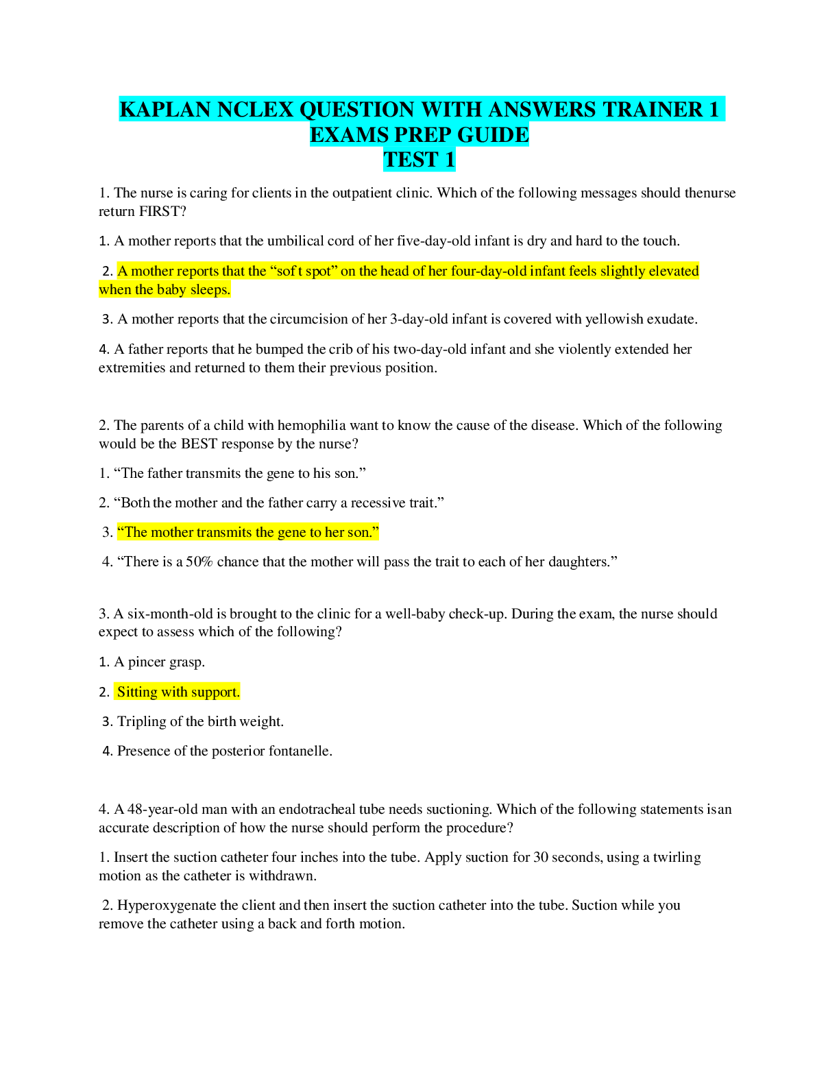 *NURSING > NCLEX > KAPLAN NCLEX QUESTION WITH ANSWERS TRAINER 1 EXAMS PREP GUIDE (Contains Questions and Answers from Test 1) | Download To Score An A