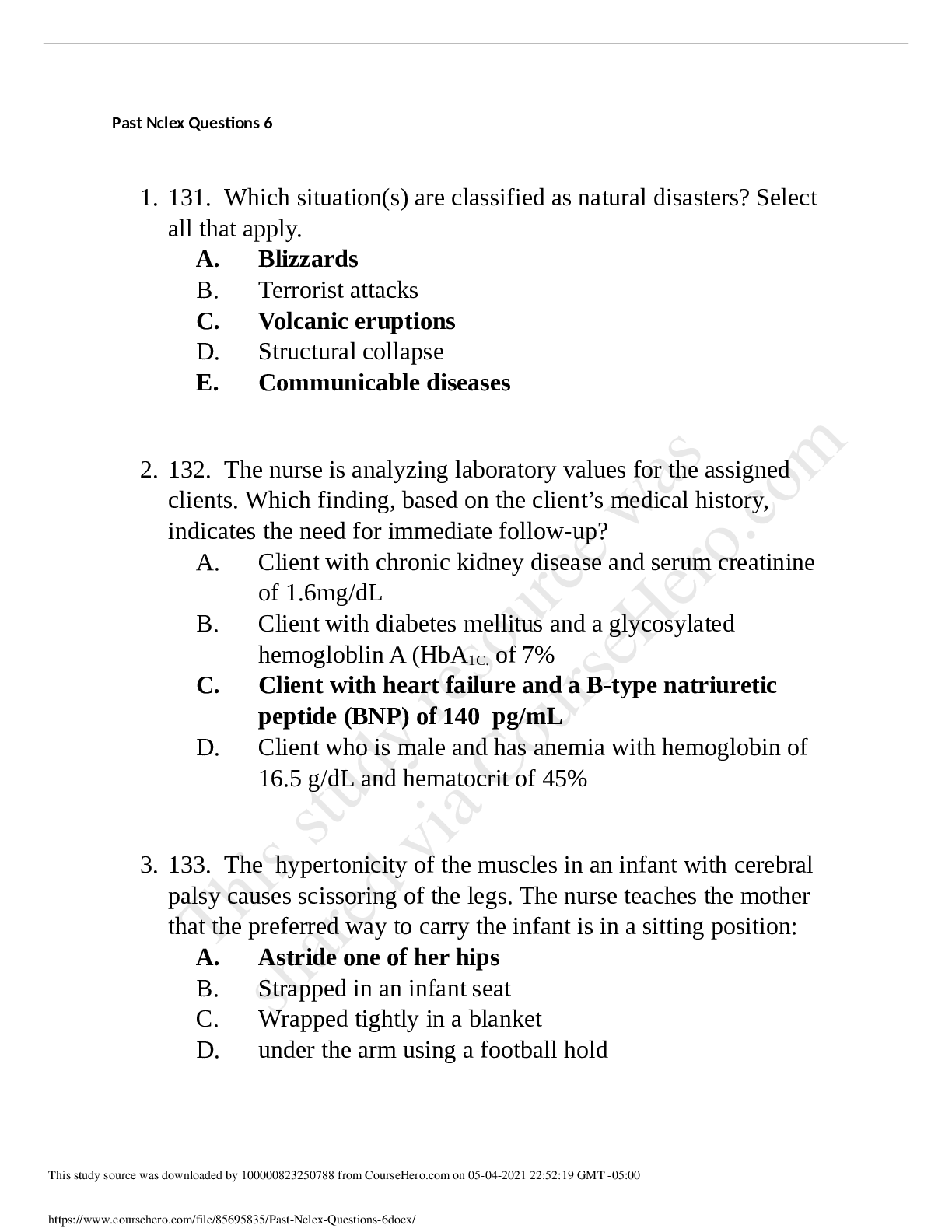 *NURSING > NCLEX > NCLEX 100 ; Past Nclex Questions 6.Revision Questions to Score A in your Exams