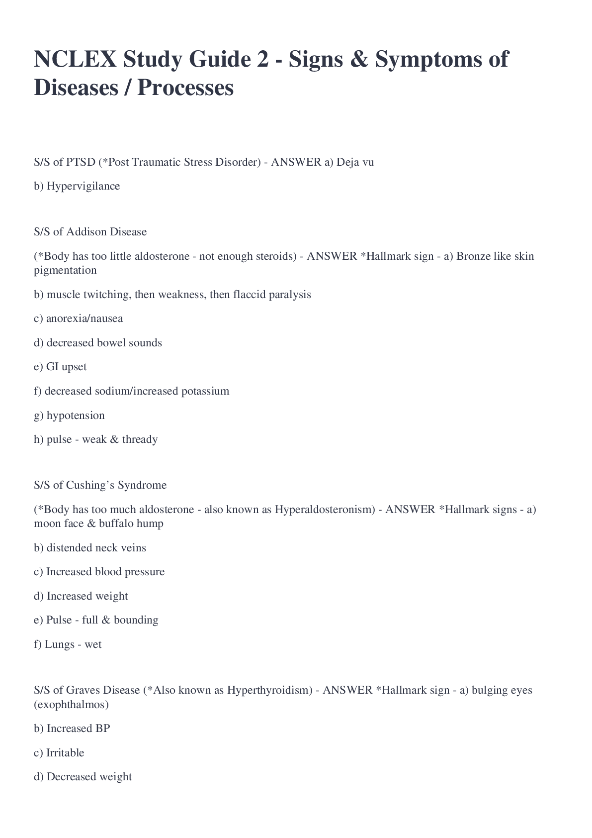 Health Care > NCLEX > NCLEX Study Guide 2 - Signs & Symptoms of Diseases / Processes Questions with correct Answers