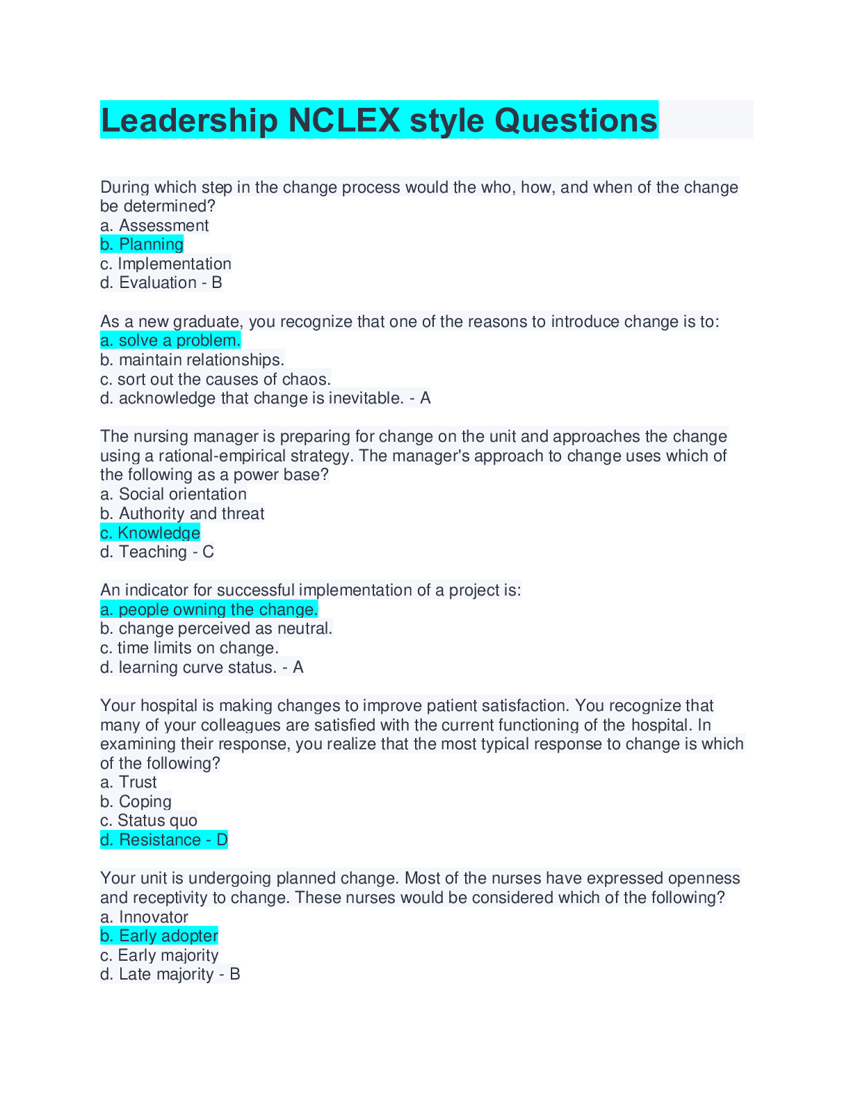 *NURSING > NCLEX > Leadership NCLEX style Questions And Answers( With Complete top Solution Graded A)