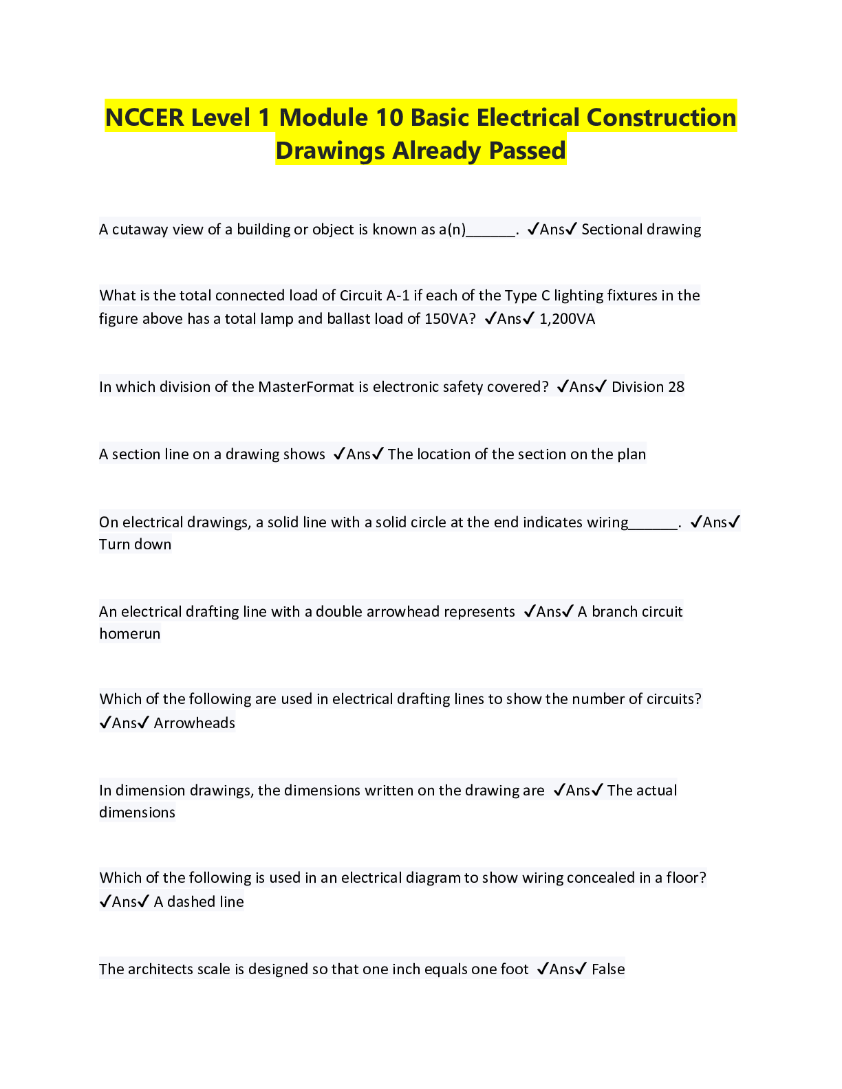 Education > QUESTIONS & ANSWERS > NCCER Level 1 Module 10 Basic Electrical Construction Drawings Already Passed