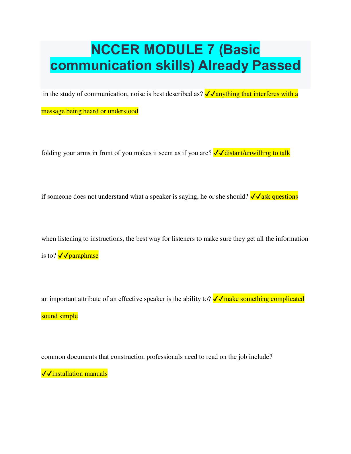 Education > QUESTIONS & ANSWERS > NCCER MODULE 7 (Basic communication skills) Questions and Answers Rated A