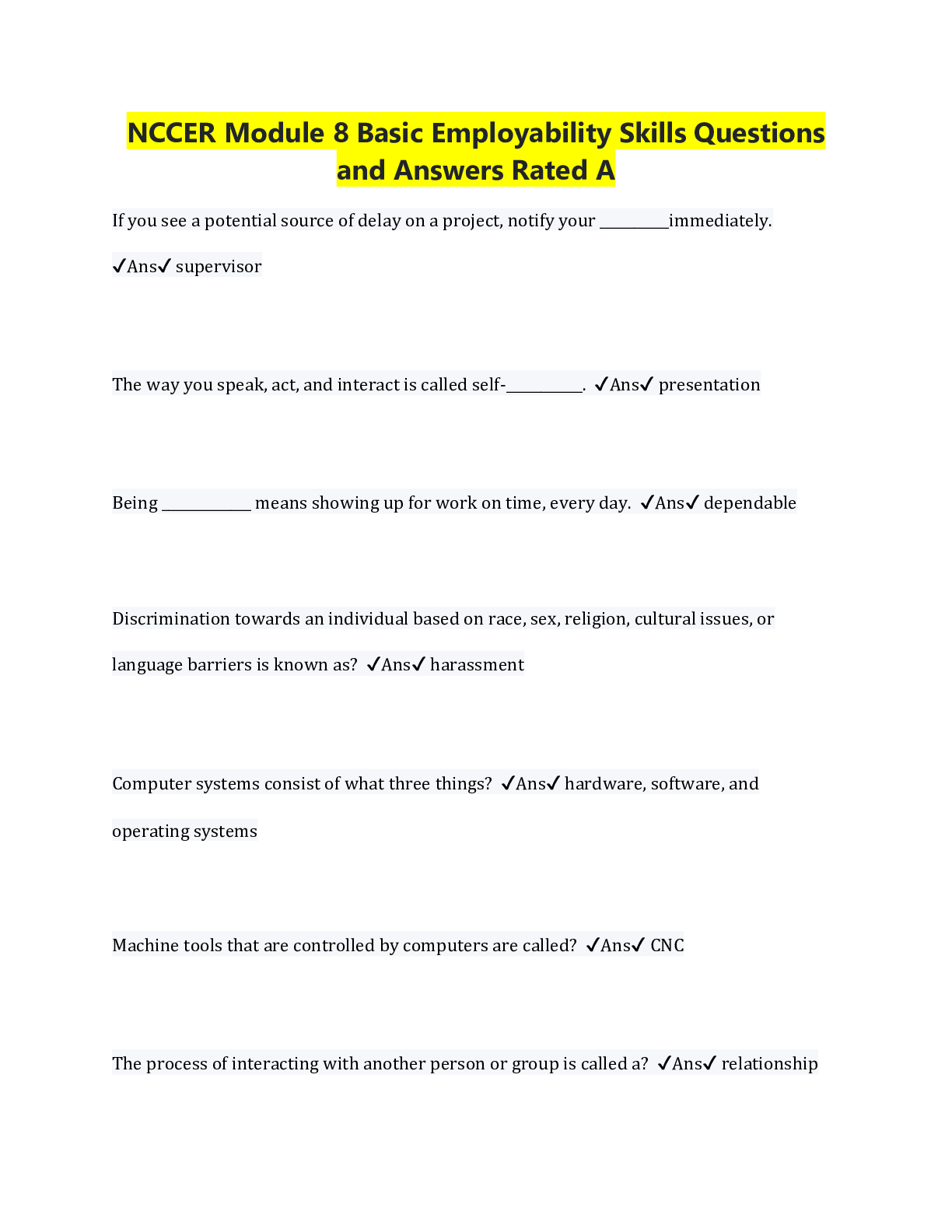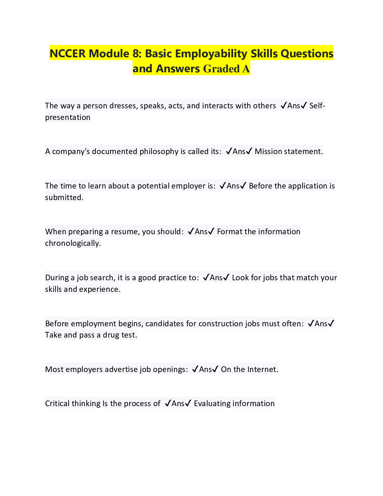 Education > QUESTIONS & ANSWERS > NCCER Module 8 Basic Employability Skills Questions and Answers Rated A