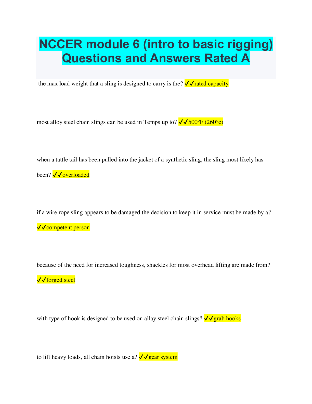 Education > QUESTIONS & ANSWERS > NCCER module 6 (intro to basic rigging) Questions and Answers Rated A
