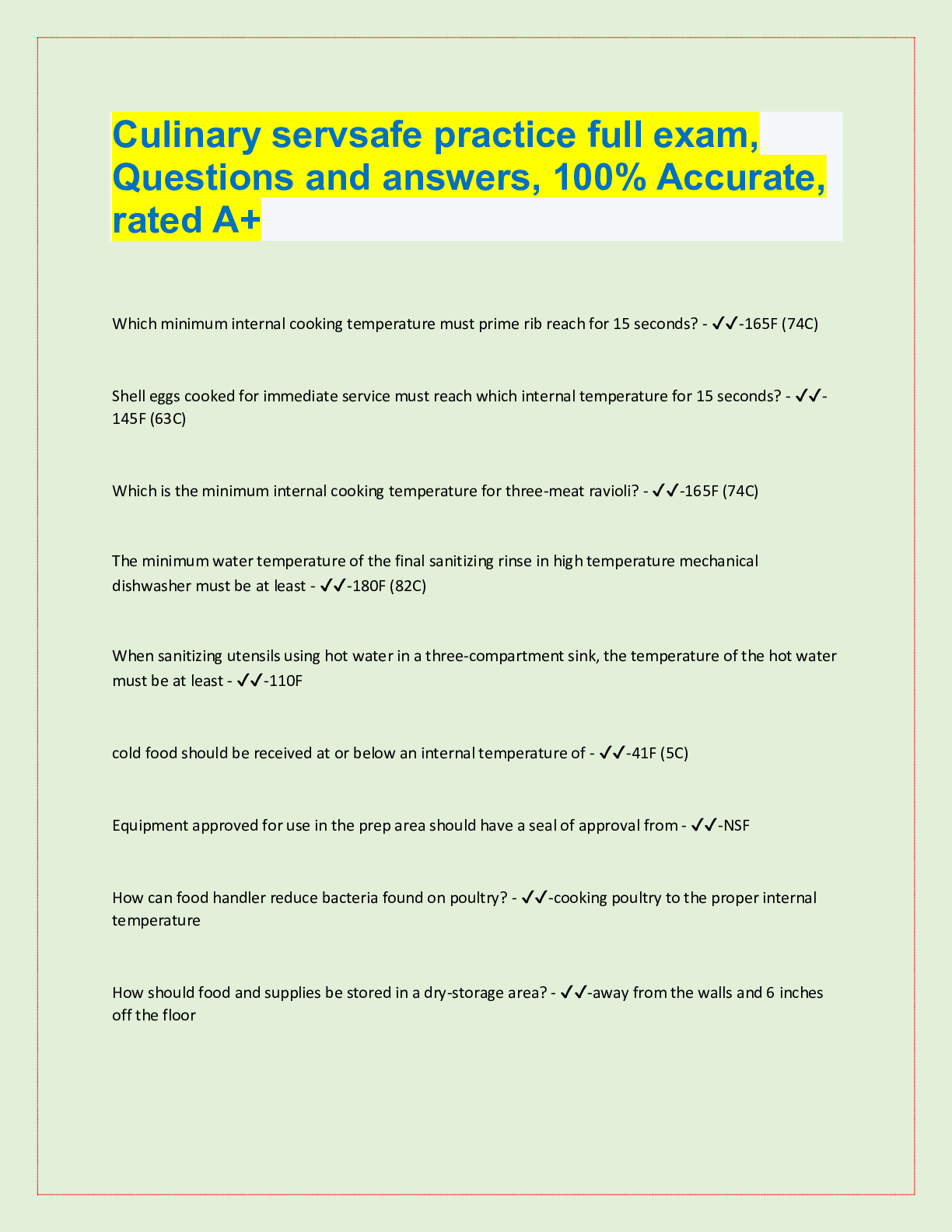 Nutrition > QUESTIONS & ANSWERS > Culinary servsafe practice full exam, Questions and answers, 100% Accurate, rated A+