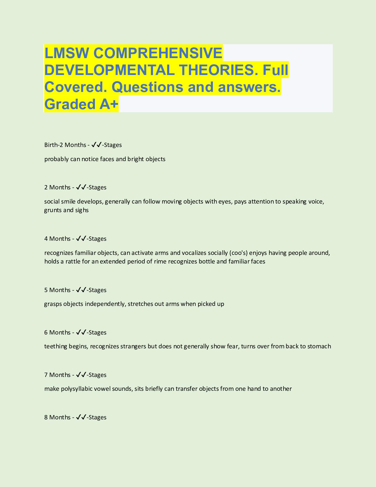 Social Sciences > QUESTIONS & ANSWERS > LMSW COMPREHENSIVE DEVELOPMENTAL THEORIES. Full Covered. Questions and answers. Graded A+