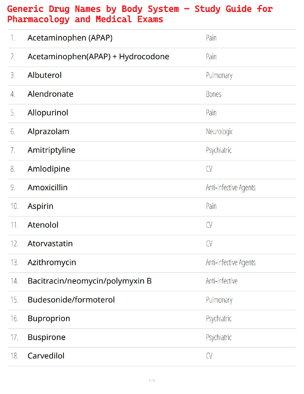 Pharmacology > QUESTIONS & ANSWERS > Generic Drug Names by Body System – Study Guide for Pharmacology and Medical Exams