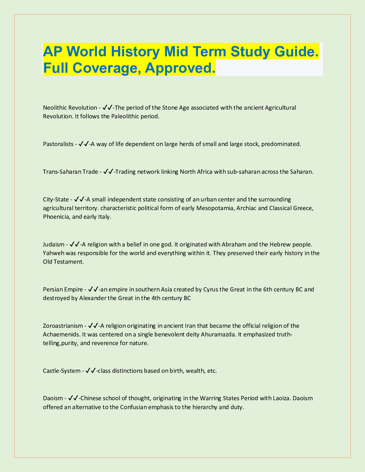 History > QUESTIONS & ANSWERS > AP World History Mid Term Study Guide. Full Coverage, Approved
