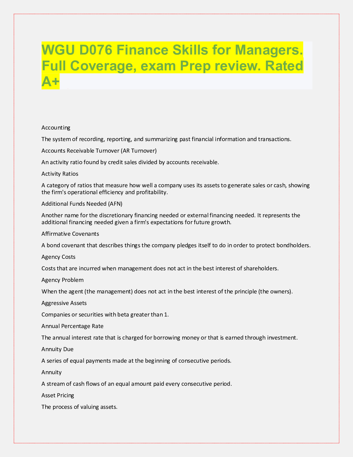 Finance > QUESTIONS & ANSWERS > WGU D076 Finance Skills for Managers. Full Coverage, exam Prep review. Rated A+