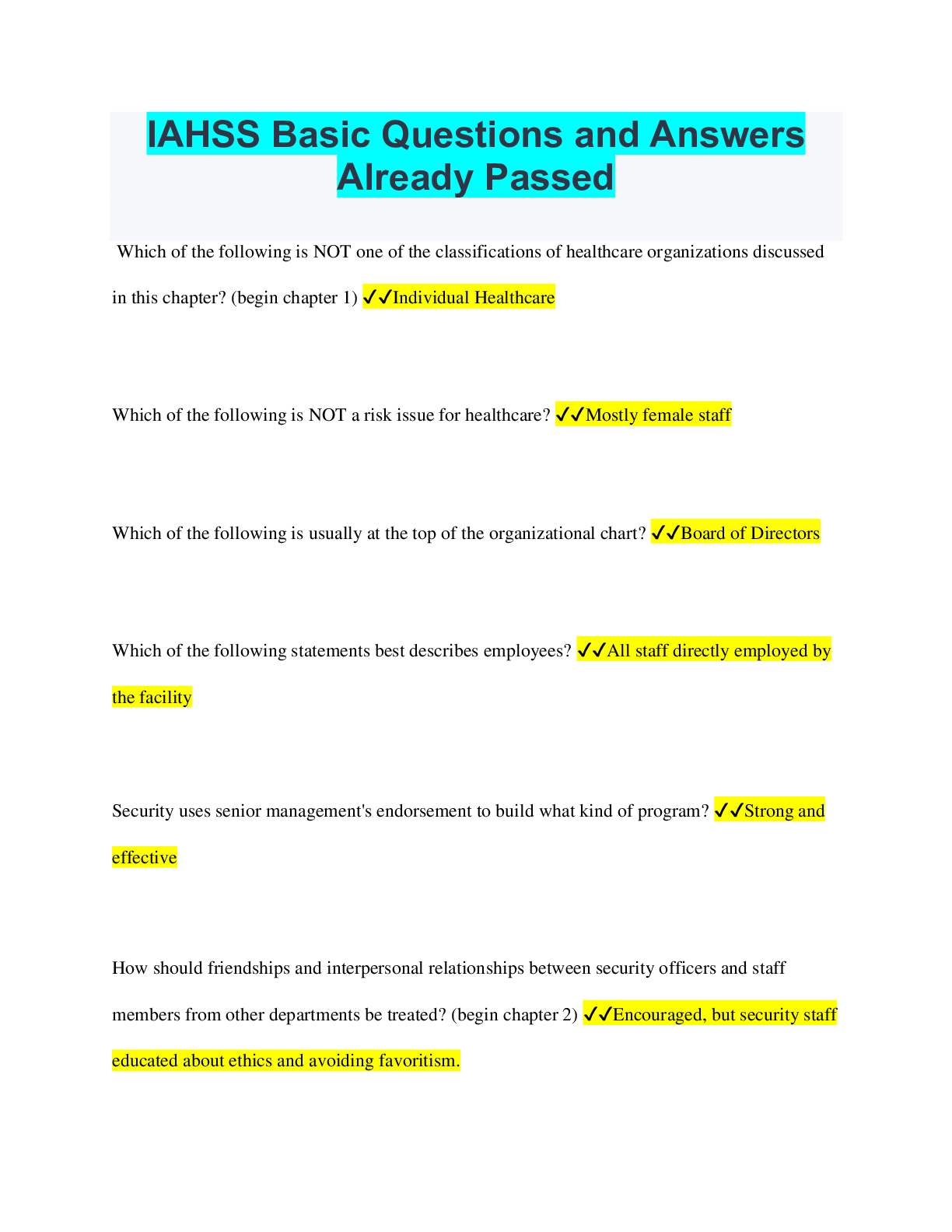 Health Care > QUESTIONS & ANSWERS > IAHSS Basic Questions and Answers Already Passed