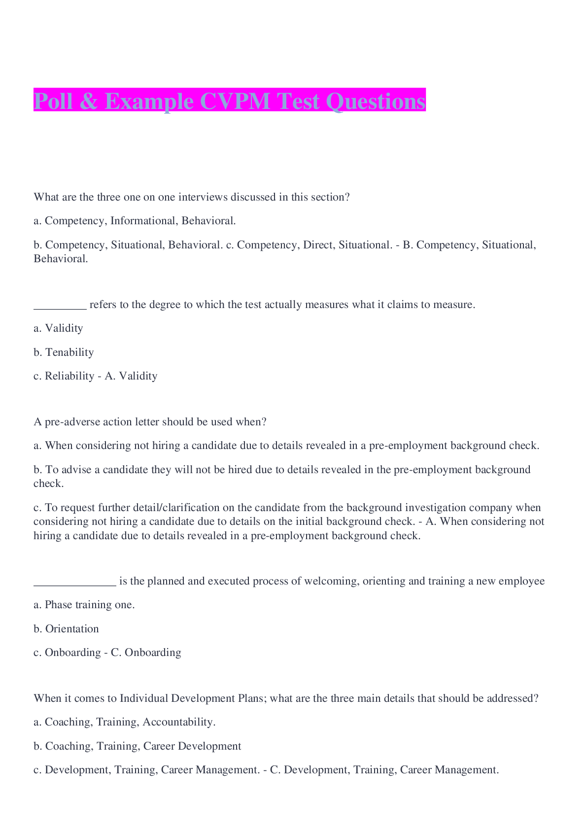 Business Administration > QUESTIONS & ANSWERS > Poll & Example CVPM Test Questions with Complete solutions 2022