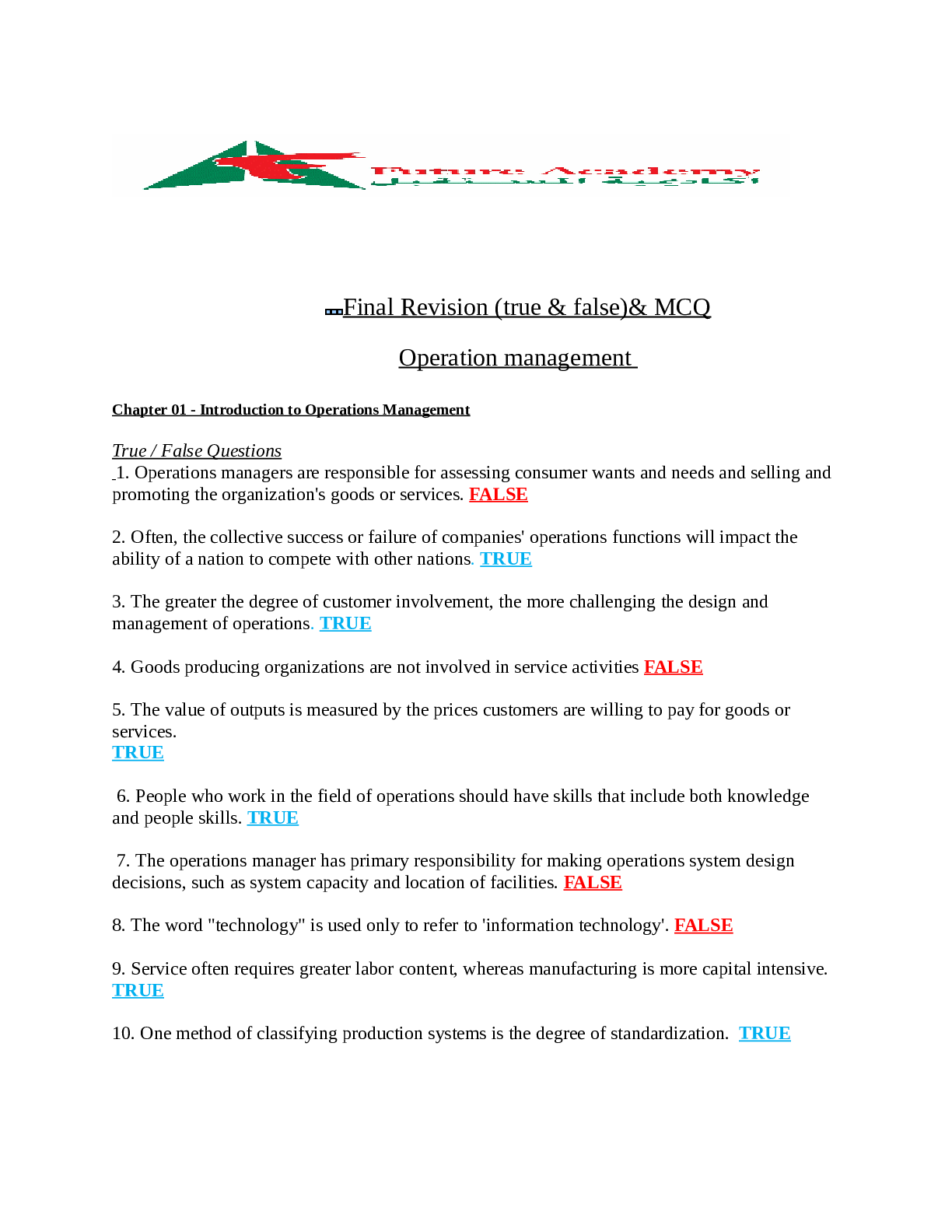 Sociology > QUESTIONS & ANSWERS > Final Revision (true & false)& MCQ Operation Management. Chapter 01 - Introduction to Operations Management, Chapter 02 - Competitiveness, Strategy, and Productivity, Chapter 03 :-Forecasting, Chapter 04 :-Product and Service Design, Chapter 06:-Process Selection and Facilities Layout, Chapter 08:-Location Planning and Analysis,