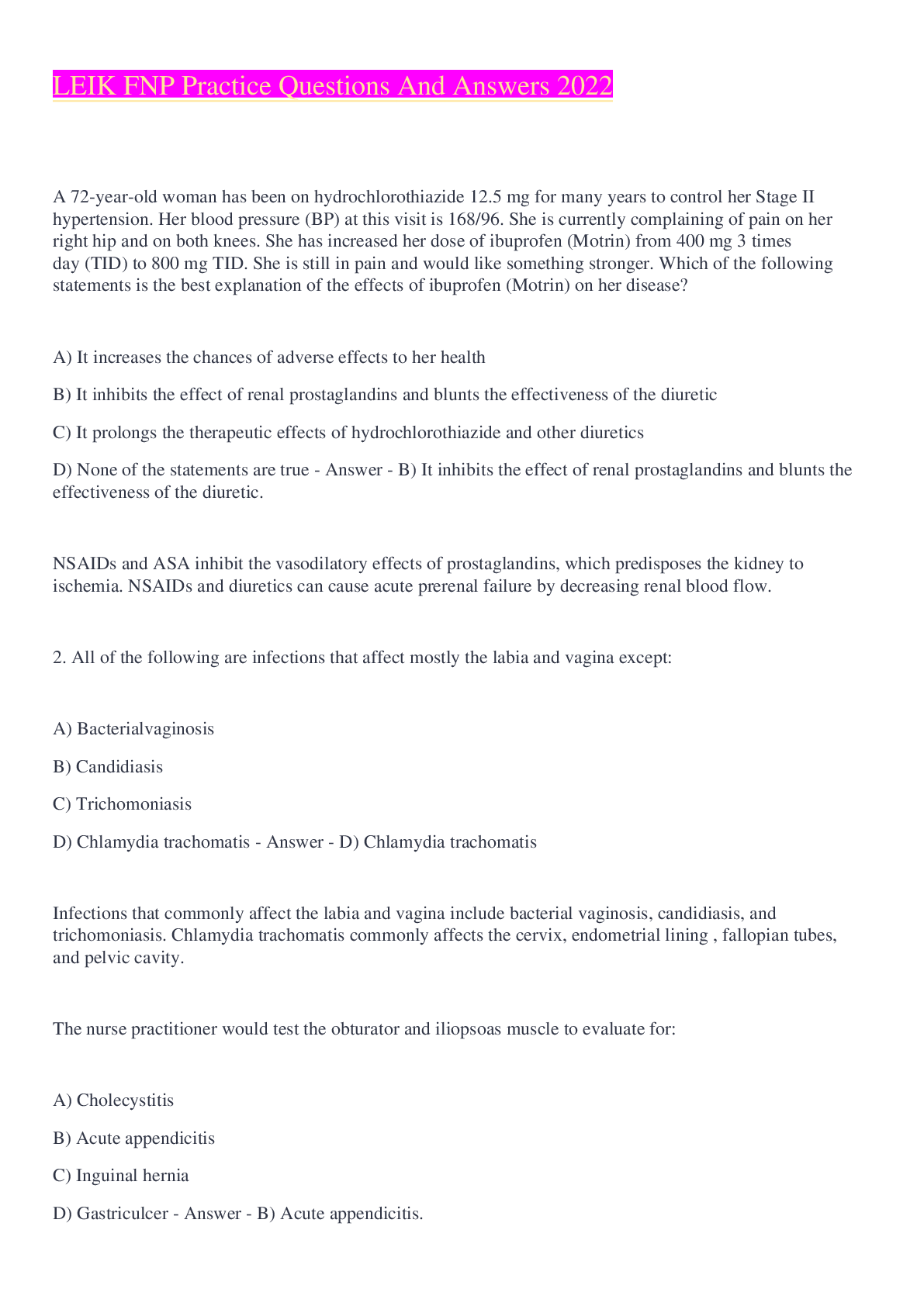 Health Care > QUESTIONS & ANSWERS > A 72-year-old woman has been on hydrochlorothiazide 12.5 mg for many years to control her Stage II hypertension. Her blood pressure (BP) at this visit is 168/96. She is currently complaining of pain on her right hip and on both knees. She has increased her dose of ibuprofen (Motrin) from 400 mg 3 times day (TID) to 800 mg TID. She is still in pain and would like something stronger. Which of the following statements is the best explanation of the effects of ibuprofen (Motrin) on her disease? A) It increases the chances of adverse effects to her health B) It inhibits the effect of renal prostaglandins and blunts the effectiveness of the diuretic C) It prolongs the therapeutic effects of hydrochlorothiazide and other diuretics D) None of the statements are true - Answer - B) It inhibits the effect of renal prostaglandins and blunts the effectiveness of the diuretic. NSAIDs and ASA inhibit the vasodilatory effects of prostaglandins, which predisposes the kidney to ischemia. NSAIDs and diuretics can cause acute prerenal failure by decreasing renal blood flow. 2. All of the following are infections that affect mostly the labia and vagina except: A) Bacterialvaginosis B) Candidiasis C) Trichomoniasis D) Chlamydia trachomatis - Answer - D) Chlamydia trachomatis Infections that commonly affect the labia and vagina include bacterial vaginosis, candidiasis, and trichomoniasis. Chlamydia trachomatis commonly affects the cervix, endometrial lining , fallopian tubes, and pelvic cavity. The nurse practitioner would test the obturator and iliopsoas muscle to evaluate for: A) Cholecystitis B) Acute appendicitis C) Inguinal hernia D) Gastriculcer - Answer - B) Acute appendicitis. Signs and symptoms of an acute abdomen include invol- untary guarding, rebound tenderness, boardlike abdomen, and a positive obtu- rator and psoas sign. A positive obturator sign occurs when pain is elicted by internal rotation of the right hip from 90 degrees hip/knee flexion. The psoas sign is positive when pain occurs with passive extension of the thigh while the patient is lying on his/her side with knees extended, or when pain occurs with active flexion of his/her thigh at the hip. Treatment for mild preeclam