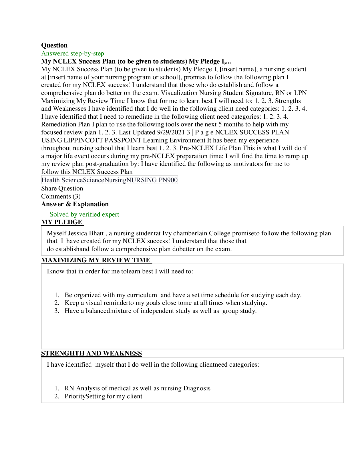 *NURSING > QUESTIONS & ANSWERS > My NCLEX Success Plan : Visualization Nursing Student Signature, RN or LPN Maximizing My Review Time I know that for me to learn best I will need