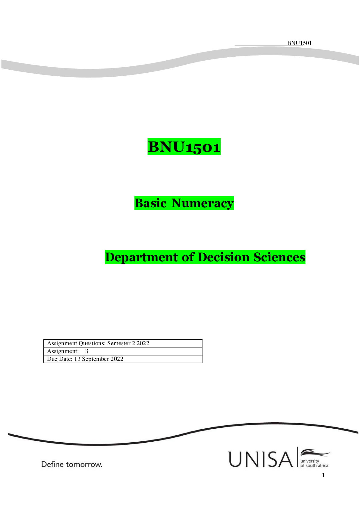 Mathematics > QUESTIONS & ANSWERS > BNU1501 Basic Numeracy Department of Decision Sciences
