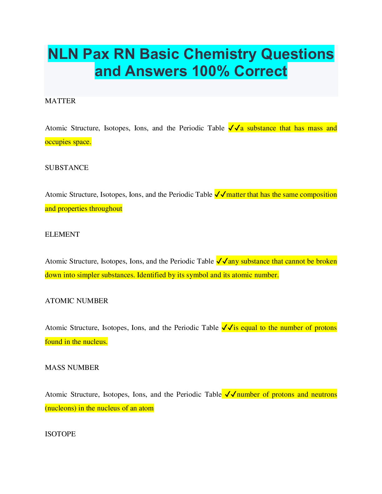 Chemistry > QUESTIONS & ANSWERS > NLN Pax RN Basic Chemistry Questions and Answers 100% Correct