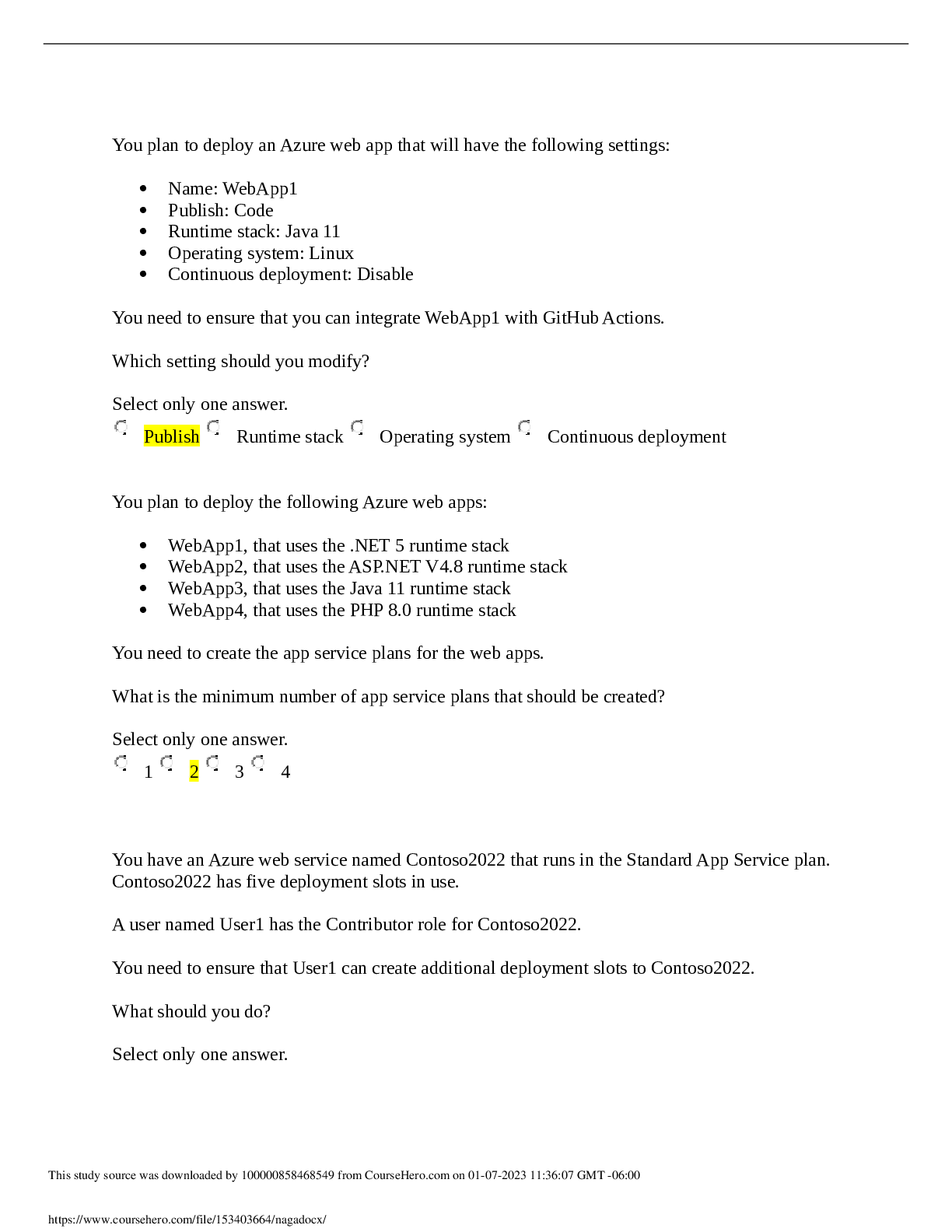 Computer Architecture > QUESTIONS & ANSWERS > San Diego State University Cyber Security_ You plan to deploy an Azure web app that will have the following settings: • Name: WebApp1 • Publish: Code • Runtime stack: Java 11 • Operating system: Linux • Continuous deployment: Disable