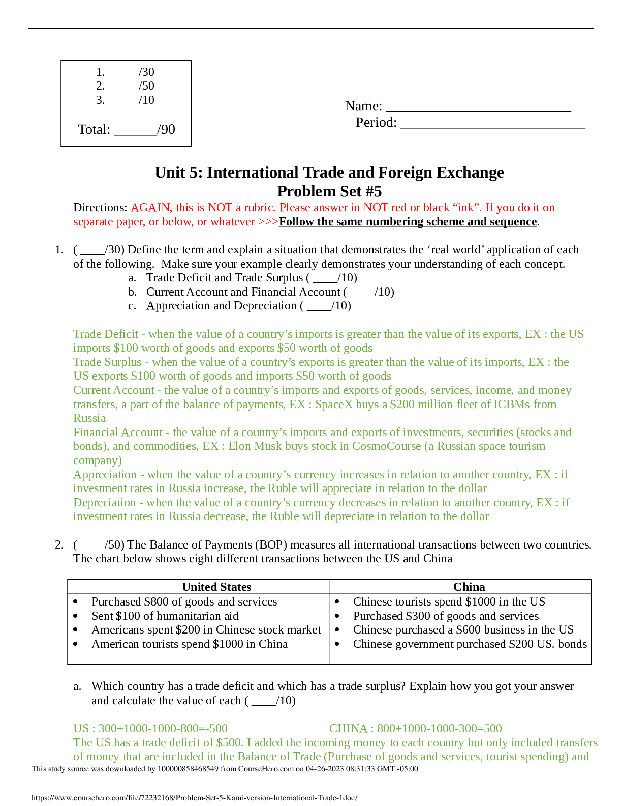 History > QUESTIONS & ANSWERS > AP WORLD HISTORY _ Unit 5: International Trade and Foreign Exchange Problem Set #5