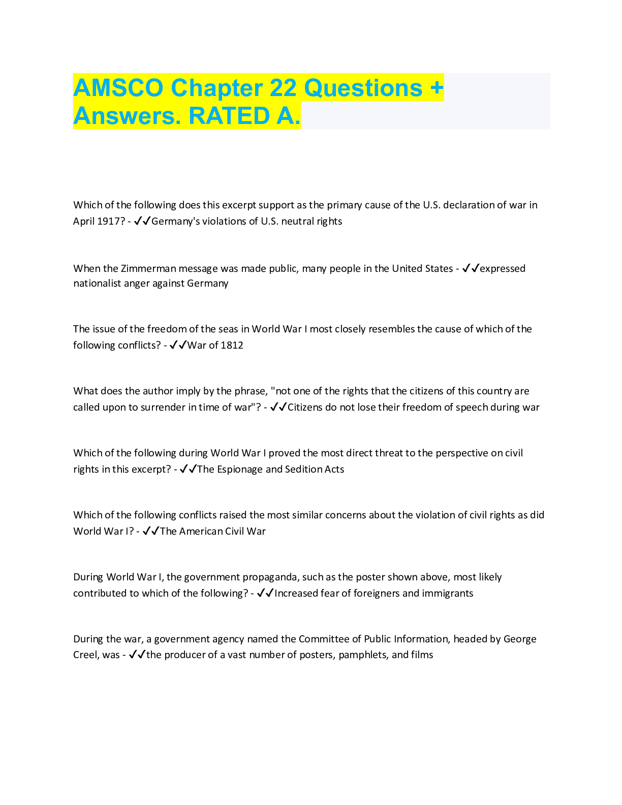 Social Sciences > QUESTIONS & ANSWERS > AMSCO Chapter 22 Questions + Answers. RATED A. Which of the following does this excerpt support as the primary cause of the U.S. declaration of war in April 1917? - ✔✔Germany's violations of U.S. neutral rights When the Zimmerman message was made public, many people in the United States - ✔✔expressed nationalist anger against Germany