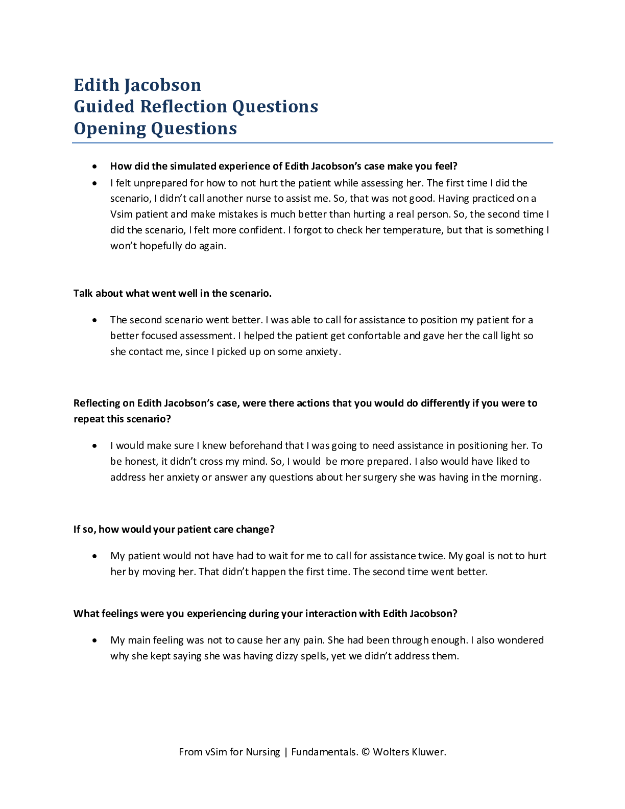 *NURSING > VSIM for NURSING FUNDAMENTALS > Edith Jacobson Fundamentals Case_GRQ. From vSim for Nursing. With Explanations on Guided Reflection Questions and the Scenario Analysis Questions.
