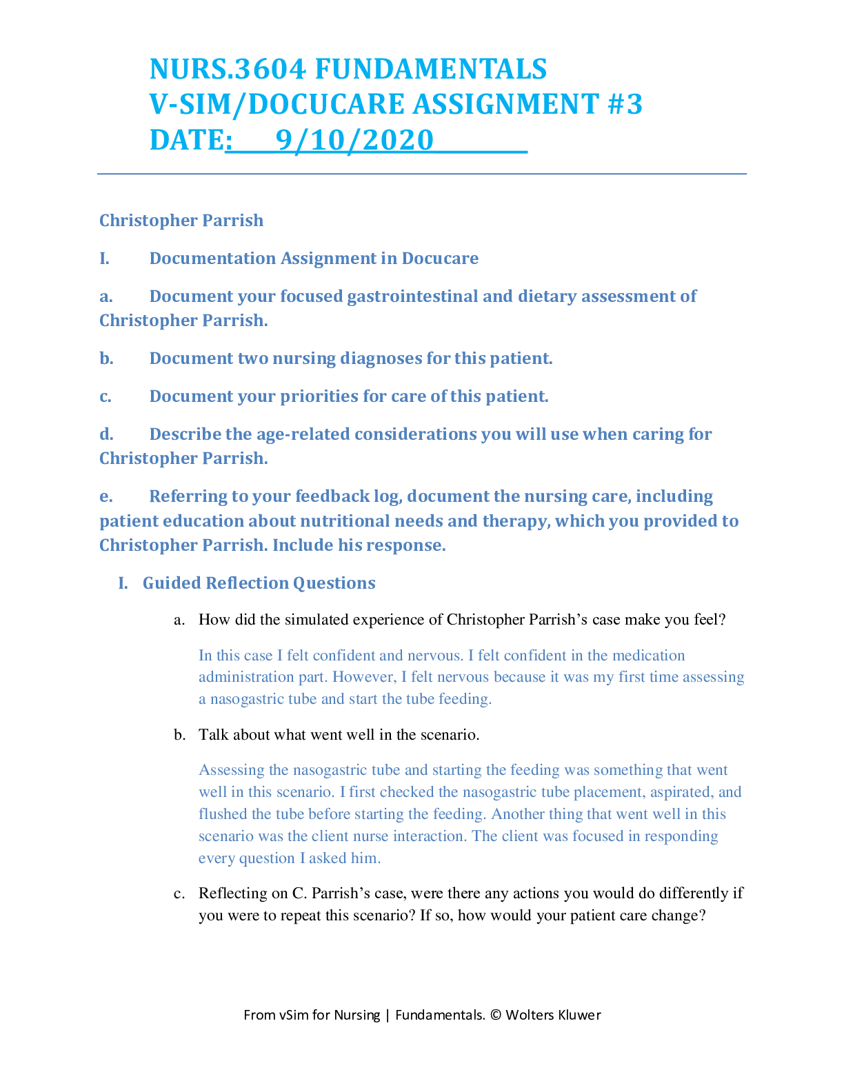 *NURSING > VSIM for NURSING FUNDAMENTALS > Fundamentals Case_Christopher Parrish_GRQ. From vSim for Nursing | Fundamentals (Fall 2020). Has the lengthy Explanations on I. Guided Reflection Questions and the II. Scenario Analysis Questions.