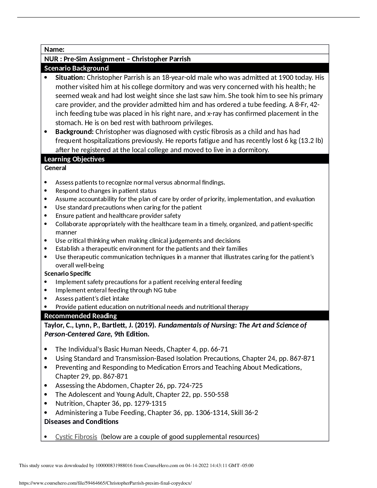 *NURSING > VSIM for NURSING FUNDAMENTALS > NUR : Pre-Sim Assignment – Christopher Parrish Scenario Background (complete solution) Fall 2020