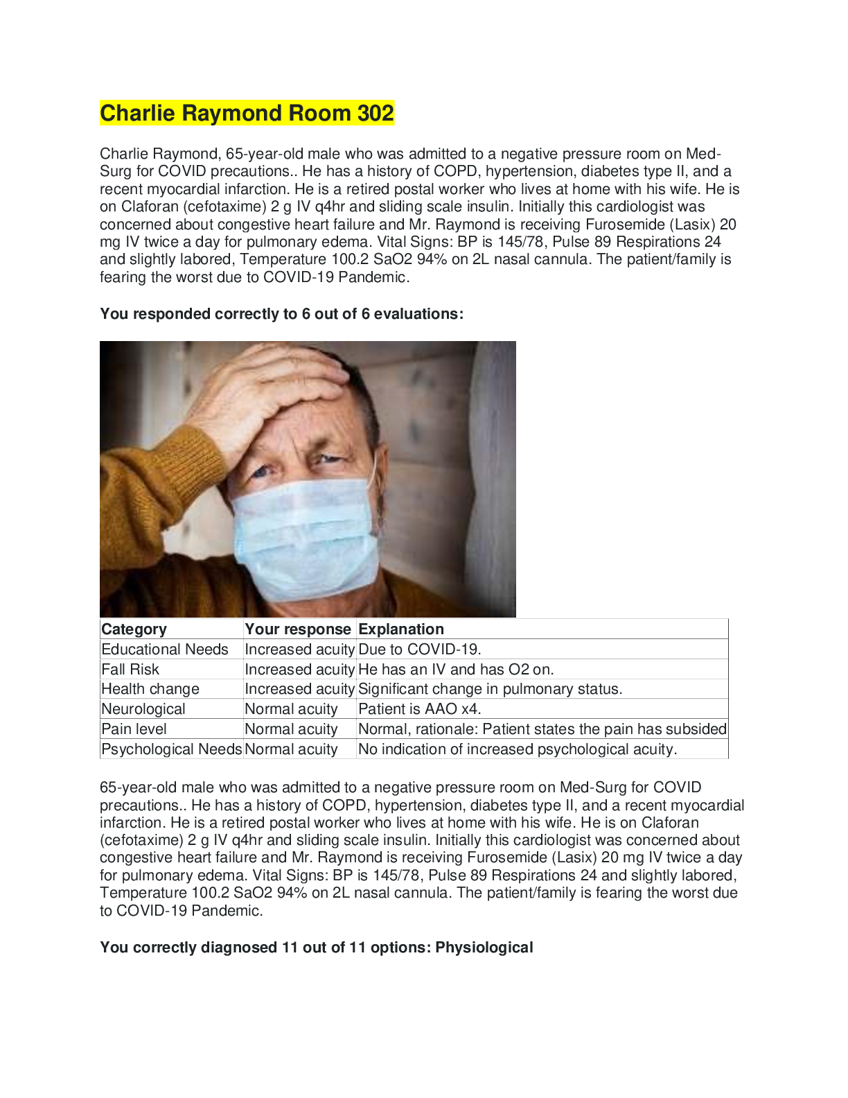 *NURSING > VSIM for NURSING FUNDAMENTALS > Charlie Raymond Room 302, complete, responded correctly to 6 out of 6 evaluations: