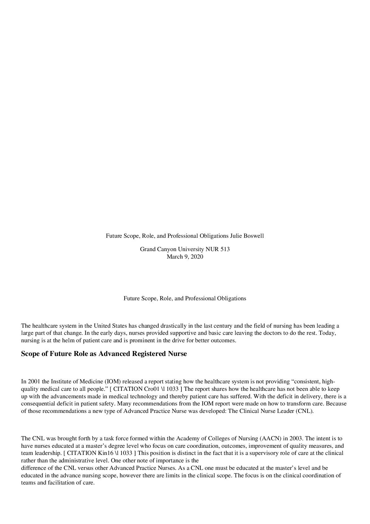 *NURSING > Solutions Guide > NUR 513 Topic 8 - Assignment Benchmark; Future Scope, Role and Professional Obligations Paper