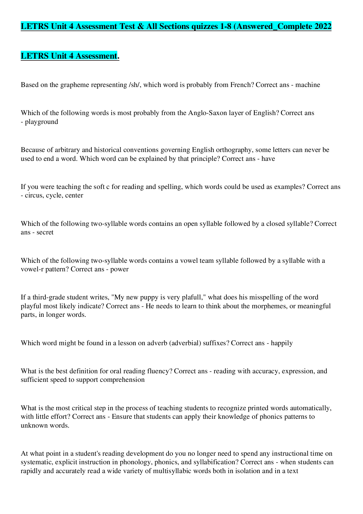 EnglishSolutions Guide  > LETRS Unit 4 Assessment Test & All Sections quizzes 1-8 (answered_Complete 2022