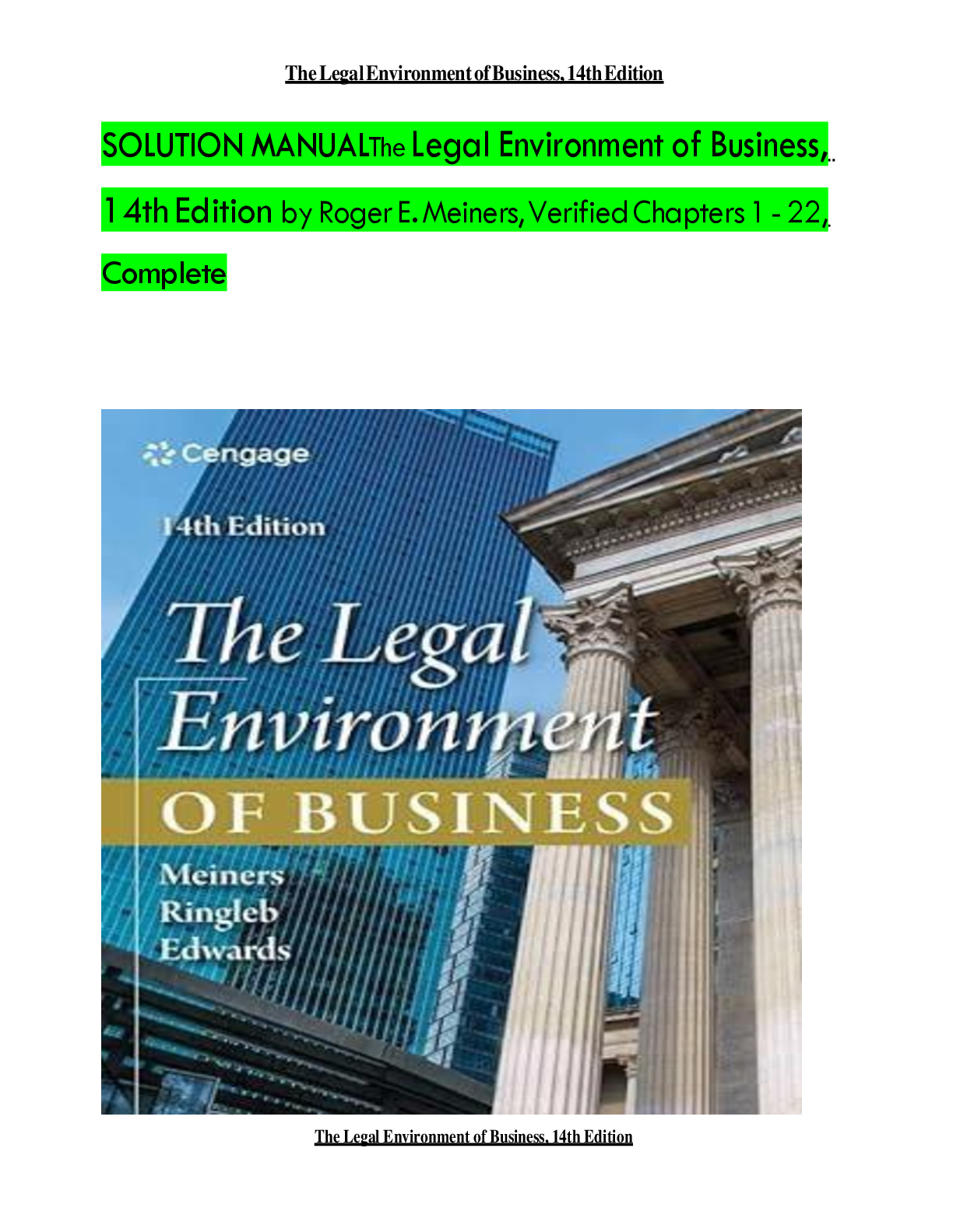 Business > SOLUTIONS MANUAL > SOLUTION MANUAL The Legal Environment of Business, 14th Edition by Roger E.Meiners,Verified Chapters1 - 22, Complete