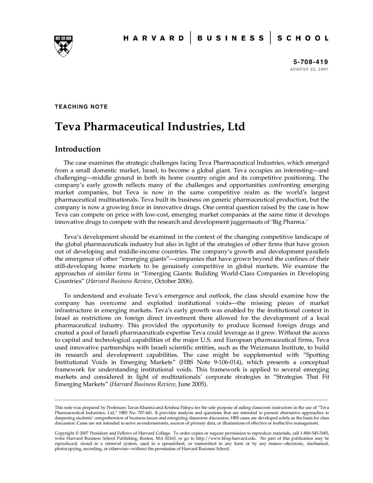 Business > CASE STUDY > Case Solutions/ Notes for Teva Pharmaceutical Industries, Ltd. By Tarun Khanna, Krishna Palepu, Claudine Deborah Madras