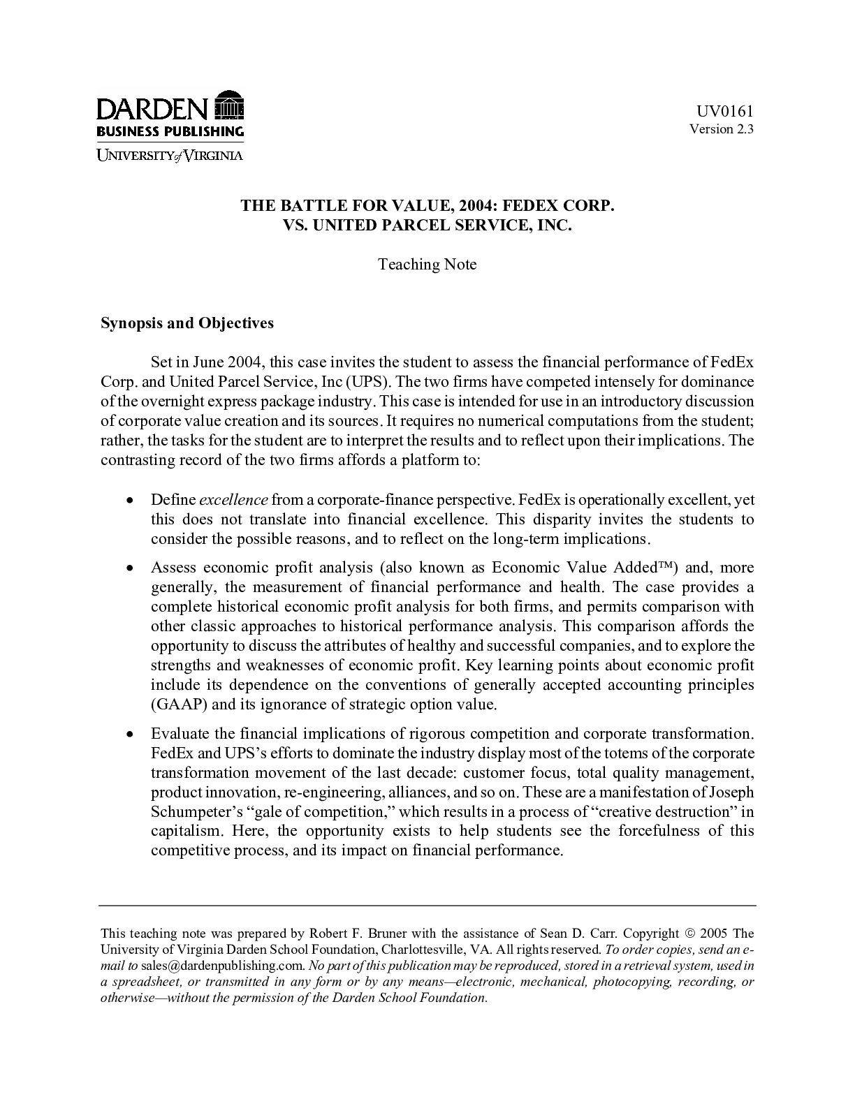 Business > CASE STUDY > Case Solutions/ Notes for The Battle for Value, 2004 FedEx Corp. vs. United Parcel Service, Inc, by Robert F. Bruner, Sean Carr