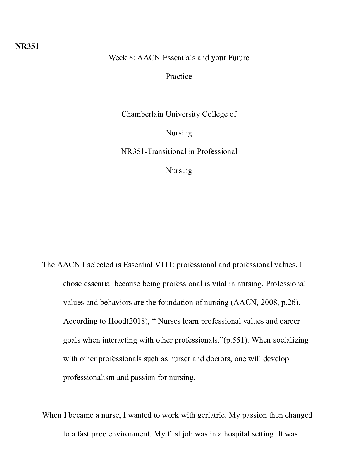 Business > CASE STUDY > week 8.edited.docx NR351 Week 8: AACN Essentials and your Future Practice Chamberlain U