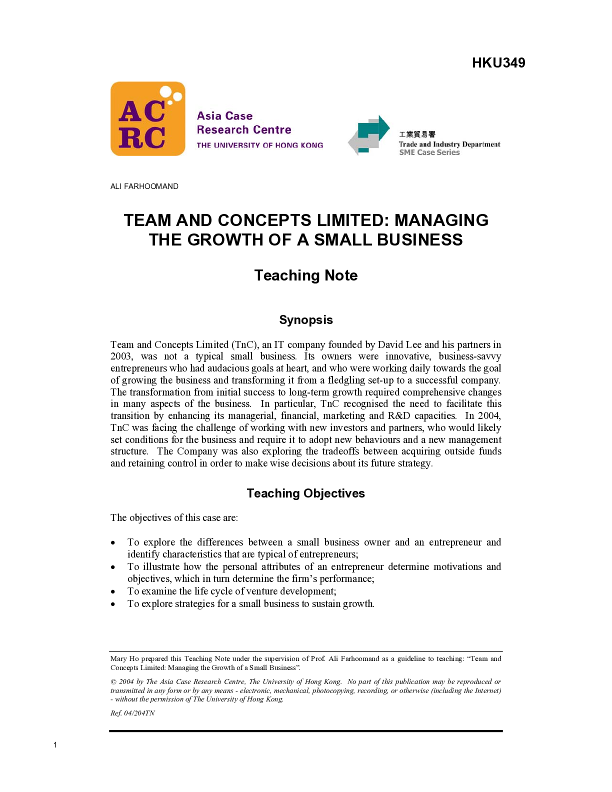 Business > CASE STUDY > Case Solutions/ Notes for Team and Concepts Ltd. Managing the Growth of a Small Business, by Ali Farhoomand, Mary Ho