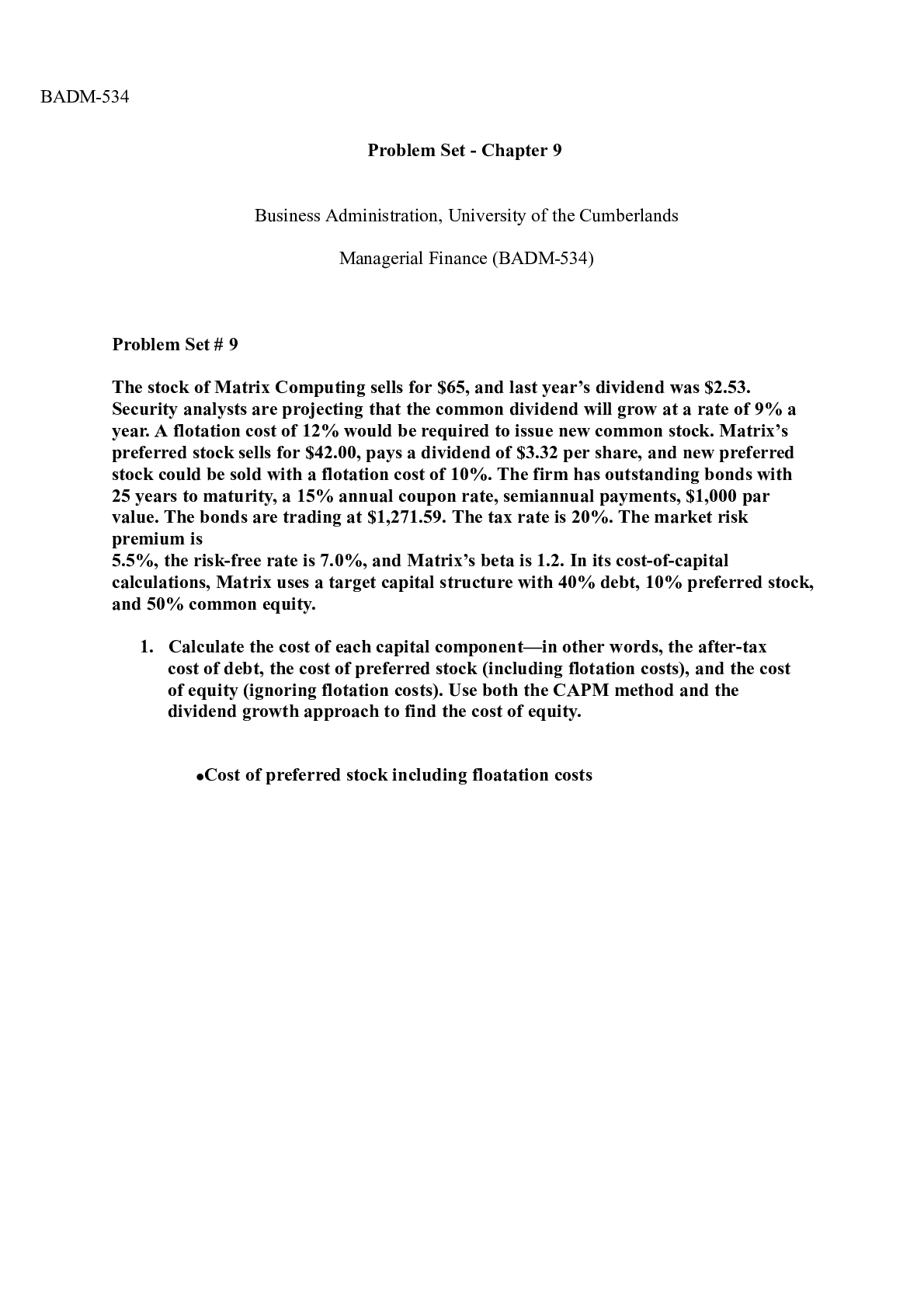Business > CASE STUDY > ProblemSet 9.docx BADM-534 Problem Set - Chapter 9 Business Administration, Universit