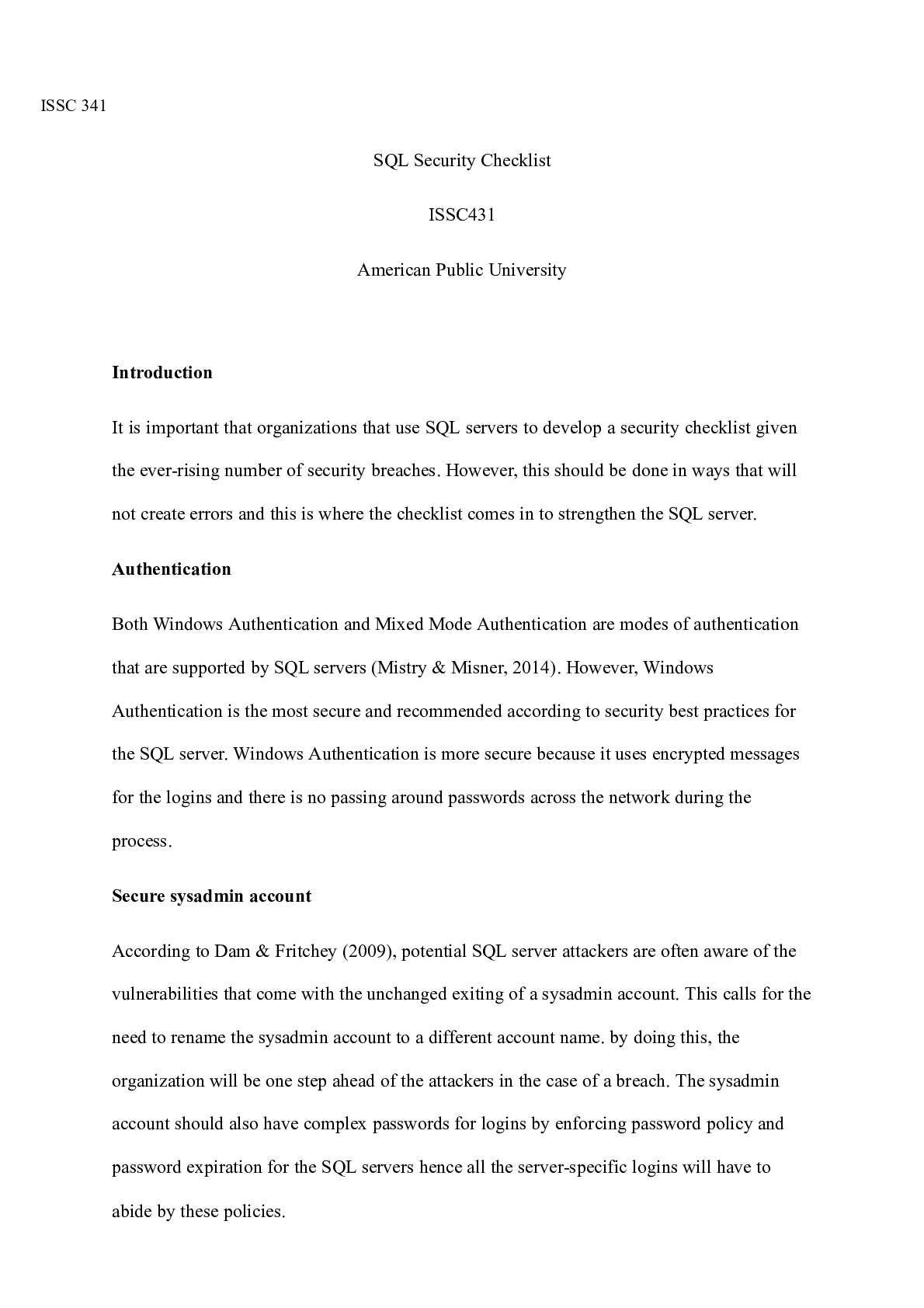 Business > CASE STUDY > Assignment 3.docx ISSC 341 SQL Security Checklist ISSC431 American Public University